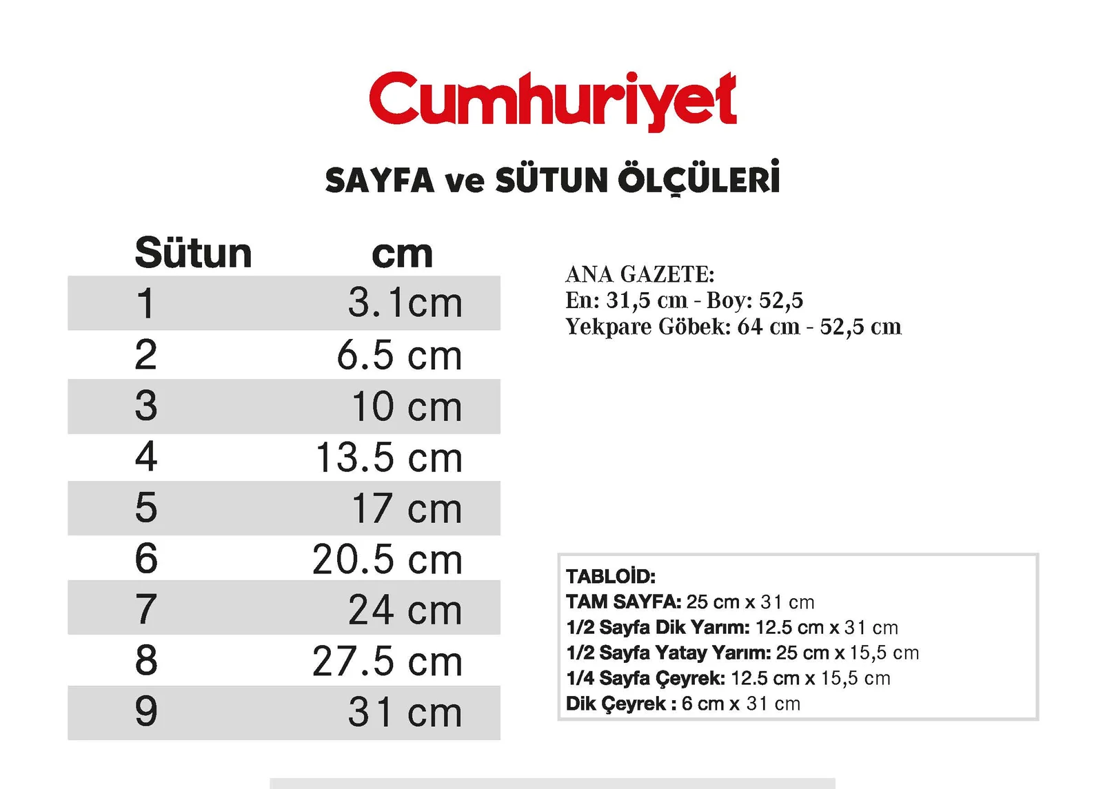 * Tam Sayfa: 274.465,-TL* Yarım Sayfa: 144.261,-TLÇeyrek Sayfa İlanlar; 17 cm en x 26 cm boy: 90.830,-TL17 cm en x 25 cm boy: 87.340,-TL13,5 cm en x 26 cm boy: 76.940,-TL13,5 cm en x 25 cm boy: 73.980,-TL17x10 cm veya 13,5x112,5 cm: 34.800,-TL13,5x10 cm: 27.840,-TL10x10 cm: 20.880,-TL10x6 cm: 12.528,-TL6,5x5 cm: 6.960,-TL