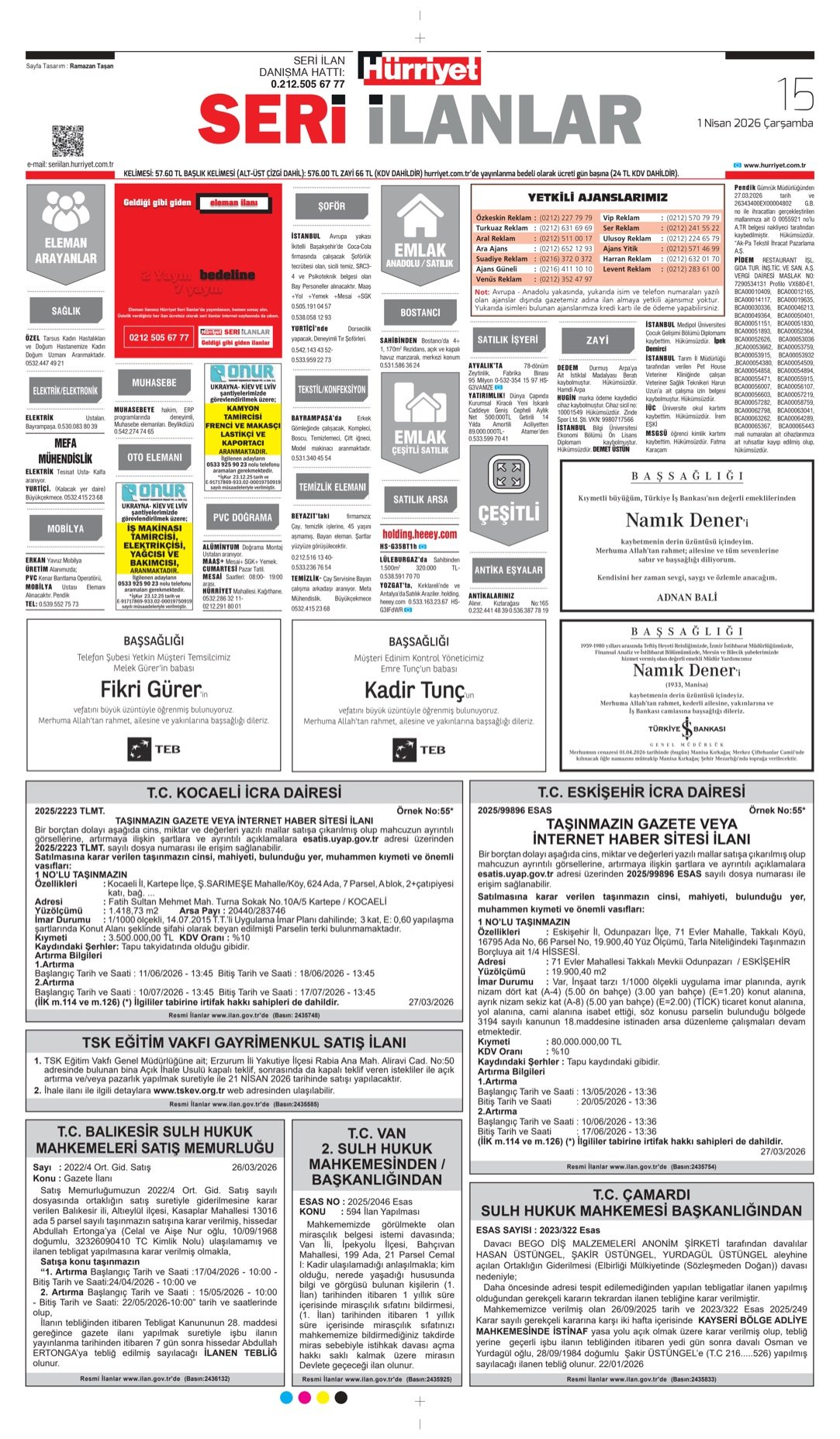 1 Nisan 2026 Hürriyet Gazetesi vefat, başsağlığı ve anma ilanları.
