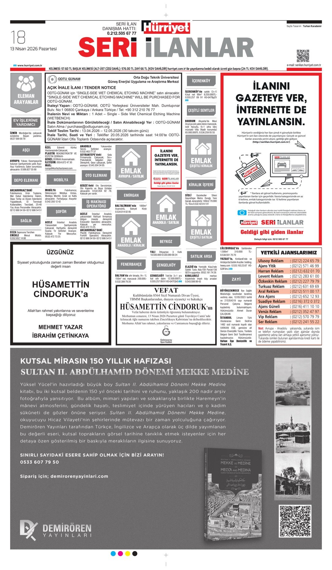 13 Nisan 2026 Hürriyet Gazetesi vefat, başsağlığı ve anma ilanları.