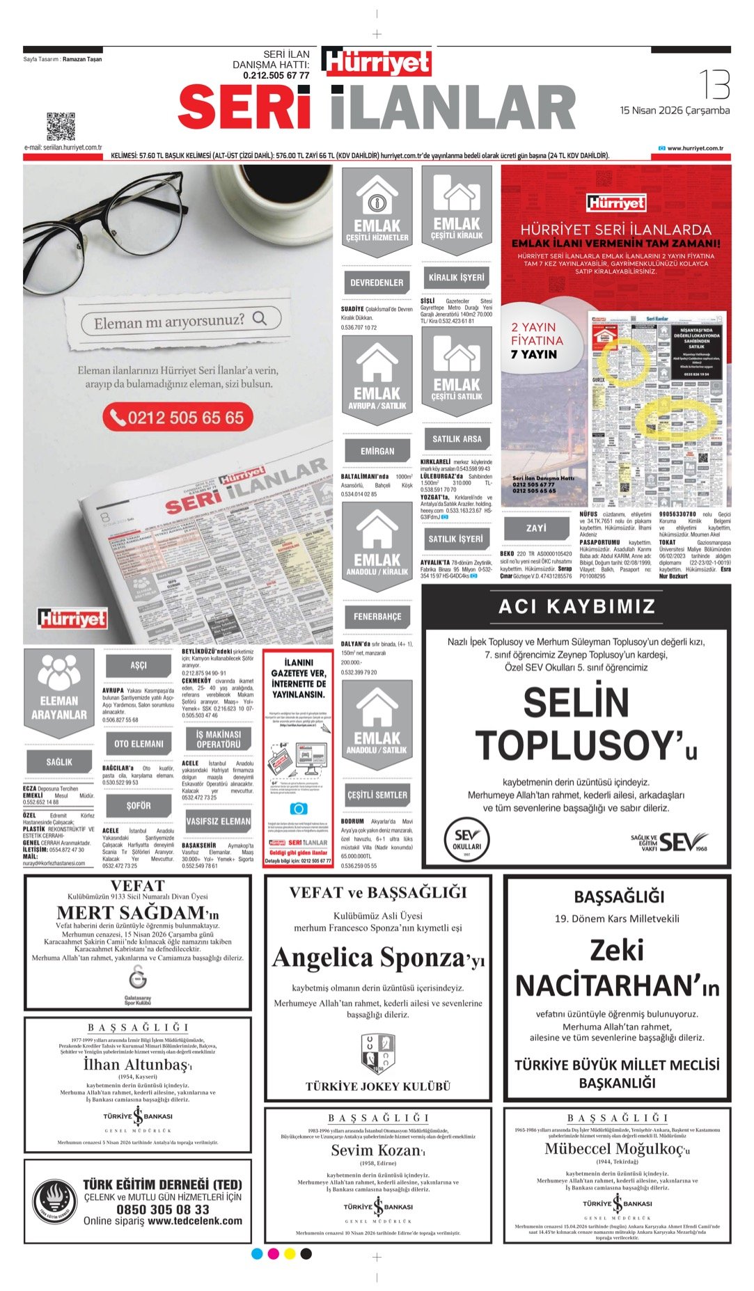 15 Nisan 2026 Hürriyet Gazetesi vefat, başsağlığı ve anma ilanları.