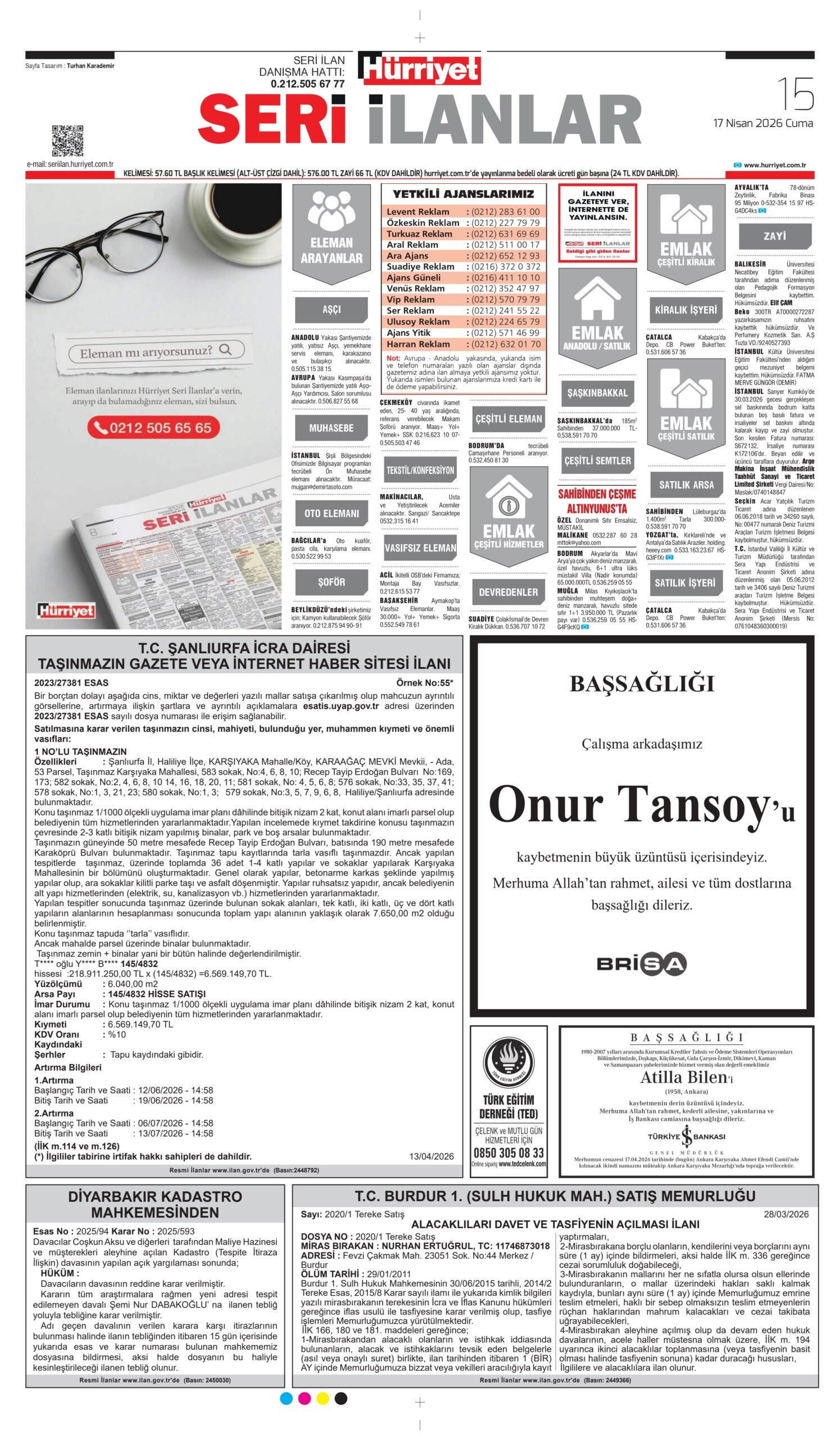 17 Nisan 2026 tarihli Hürriyet Gazetesi vefat, başsağlığı ve anma ilanları.