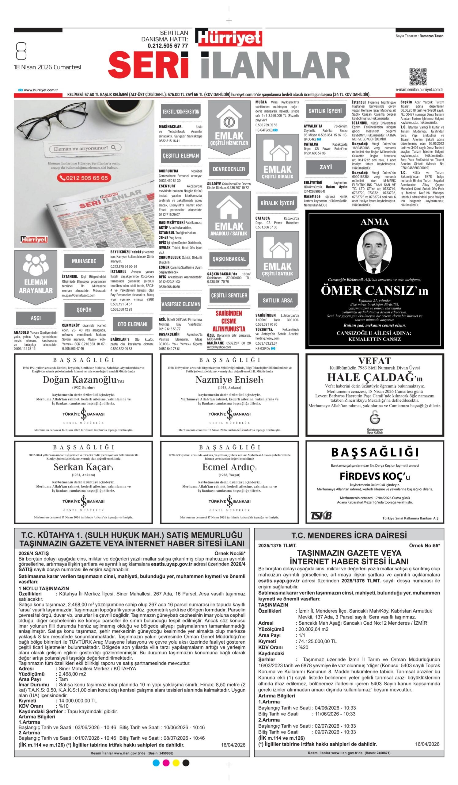 16 Nisan 2026 Hürriyet Gazetesi vefat, başsağlığı ve anma ilanları.