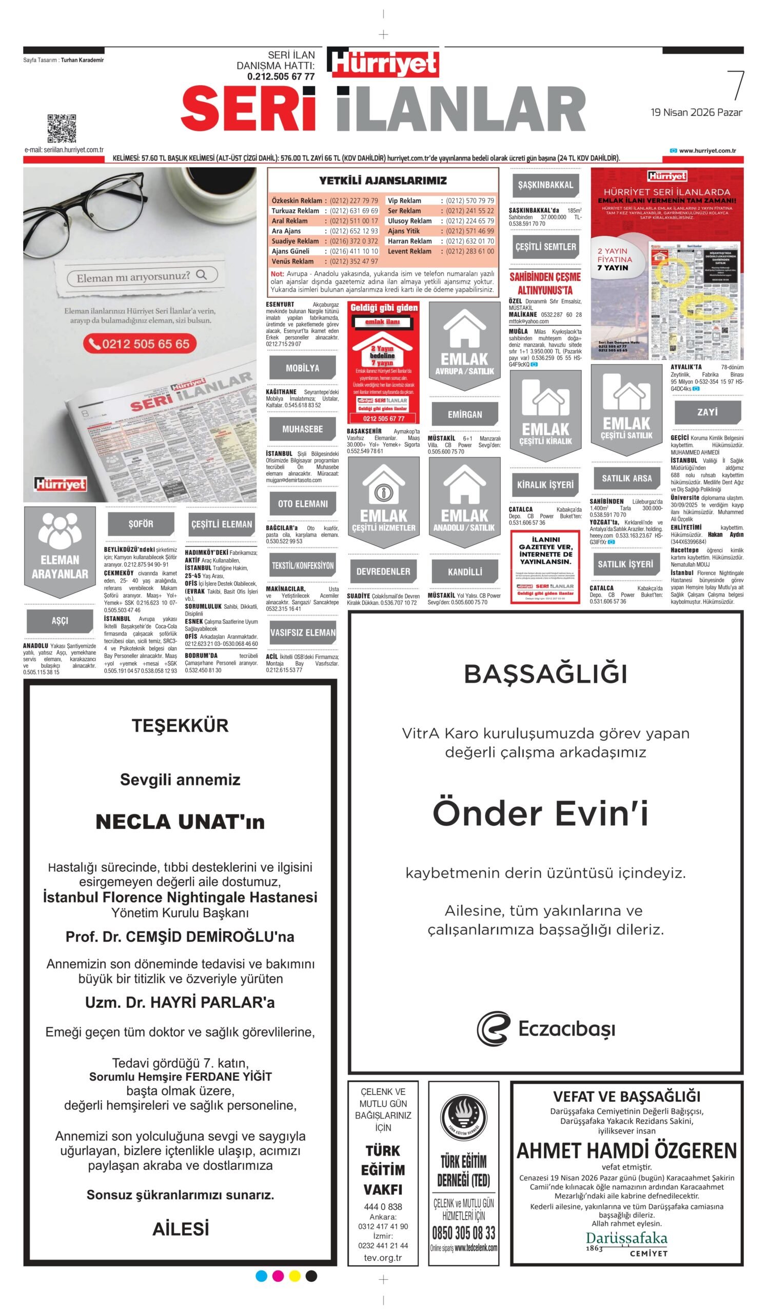 19 Nisan 2026 tarihli Hürriyet Gazetesi vefat, başsağlığı ve anma ilanları.