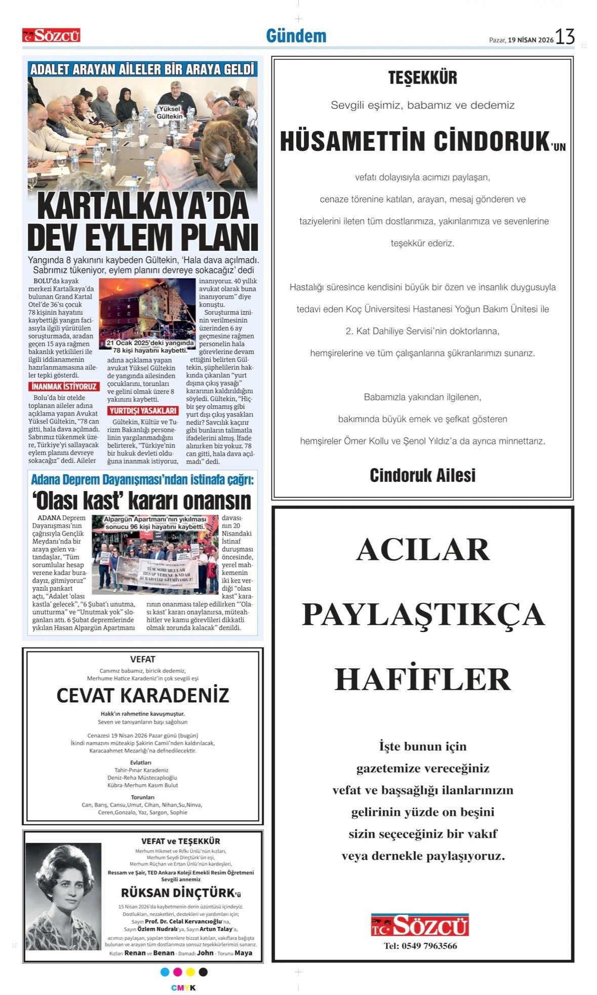 19 Nisan 2026 Sözcü Gazetesi vefat, başsağlığı ve anma ilanları.