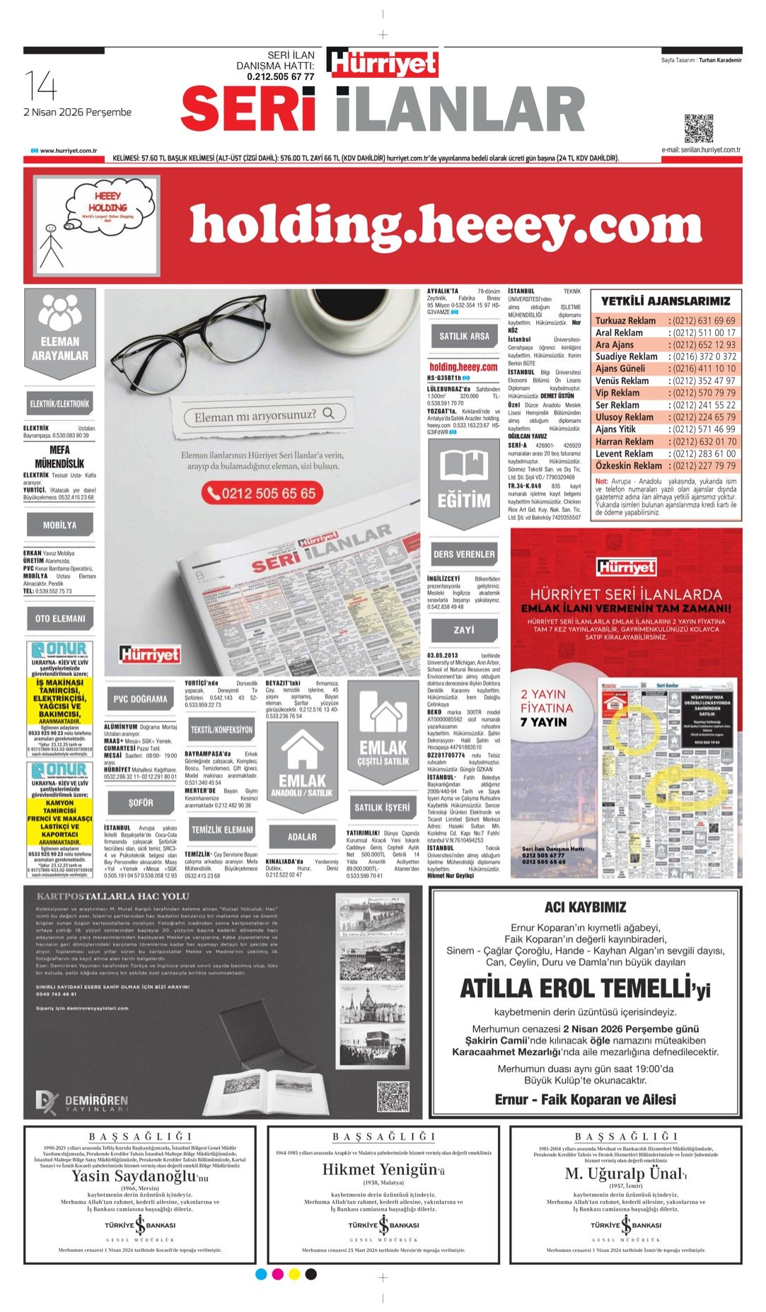 2 Nisan 2026 Hürriyet Gazetesi vefat, başsağlığı ve anma ilanları.