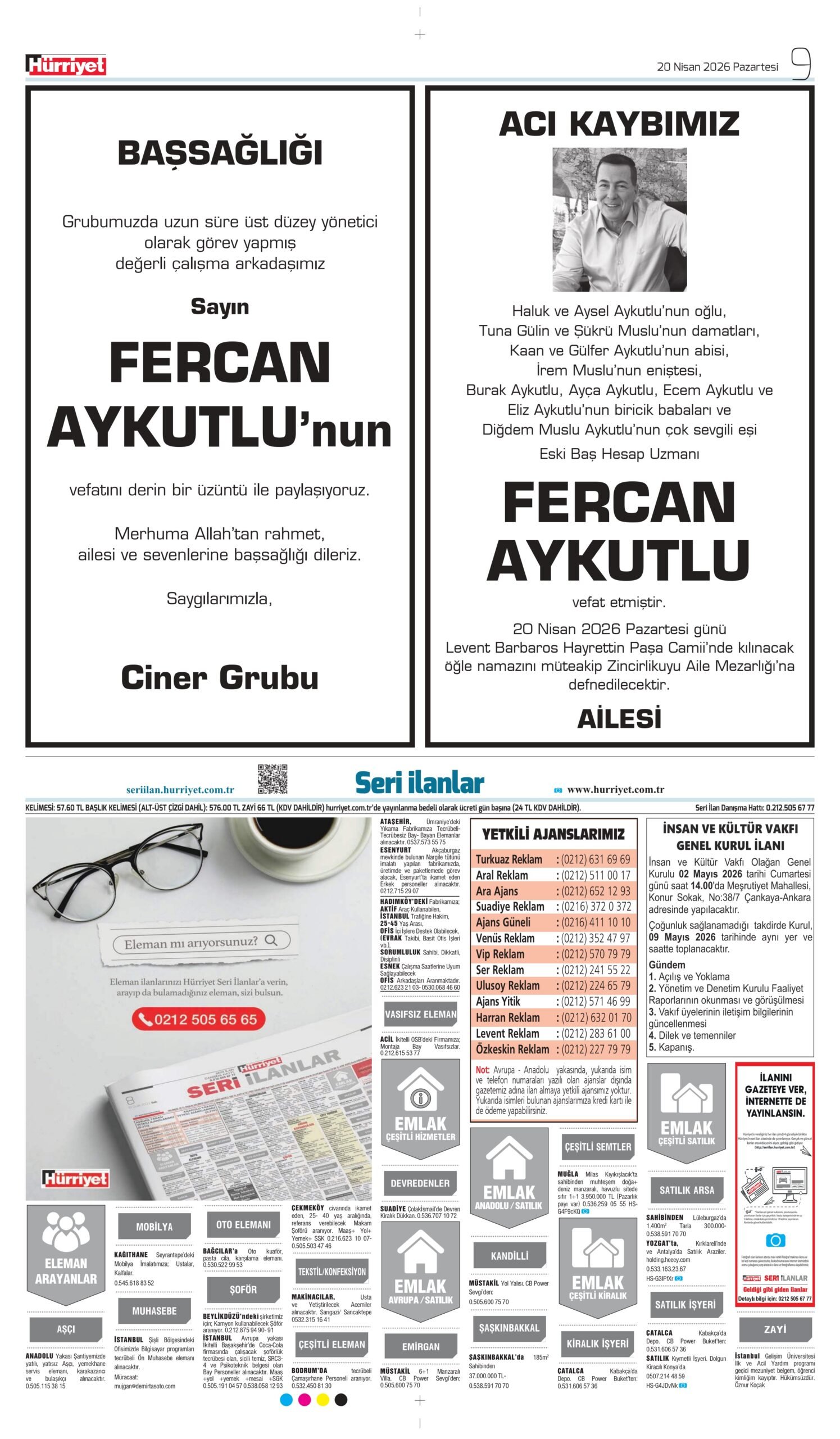 20 Nisan 2026 tarihli Hürriyet Gazetesi vefat, başsağlığı ve anma ilanları.