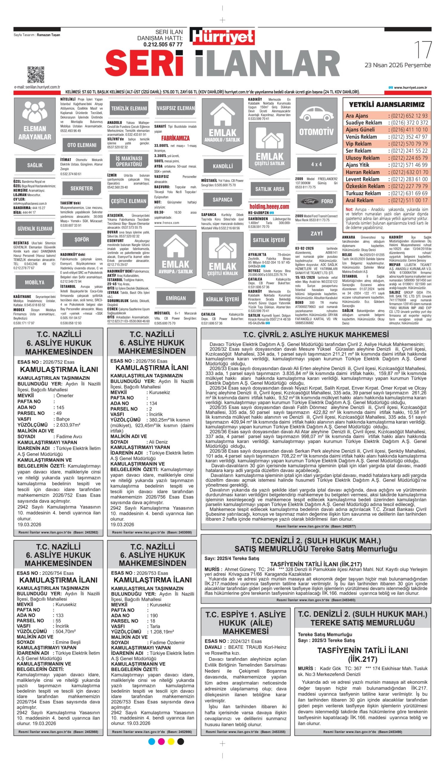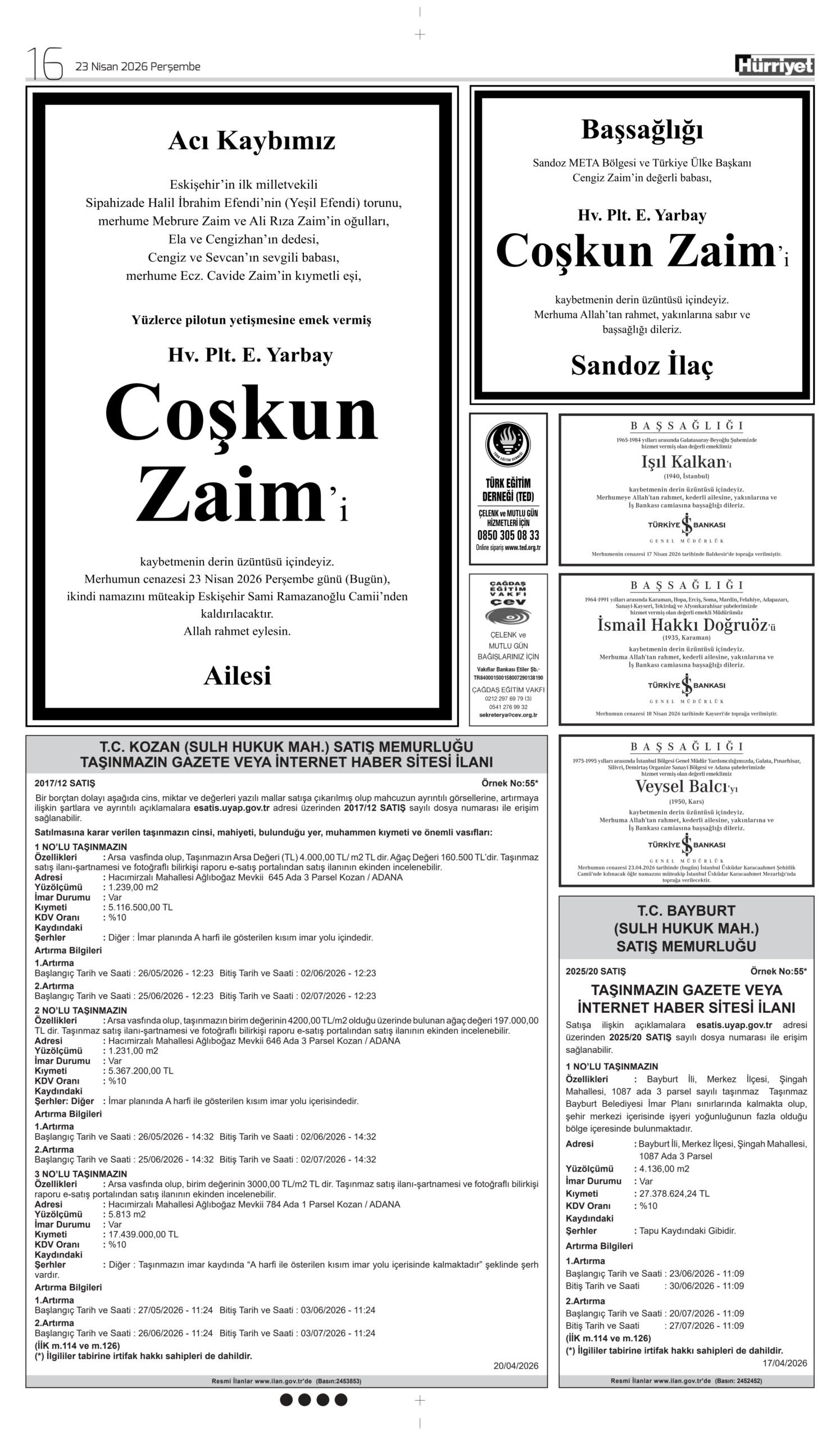 23 Nisan 2026 tarihli Hürriyet Gazetesi vefat, başsağlığı ve anma ilanları.