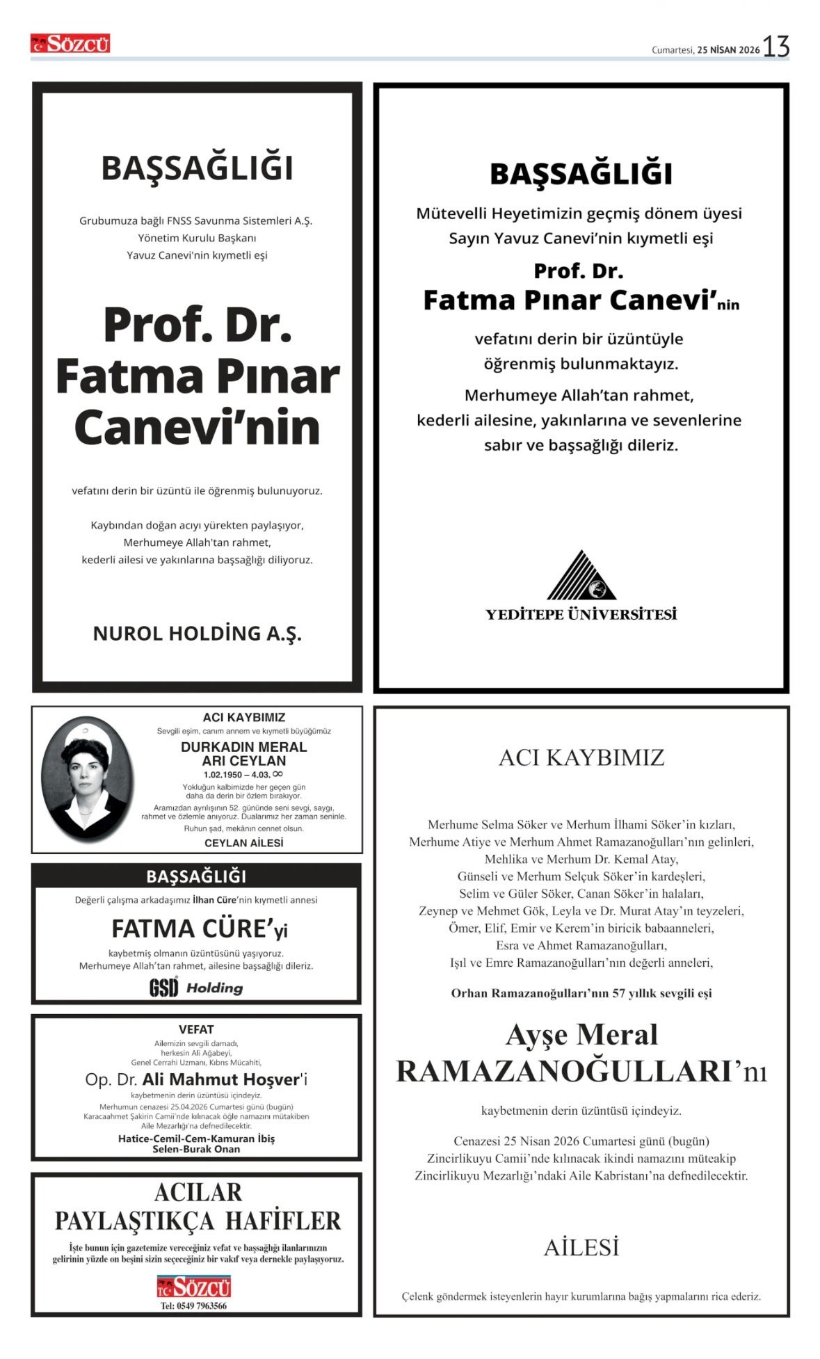 25 Nisan 2026 tarihli Sözcü Gazetesi vefat, başsağlığı ve anma ilanları. İstanbul, Ankara, İzmir ve Adana baskılarında yer alan ilanlar yayınlanmaktadır.