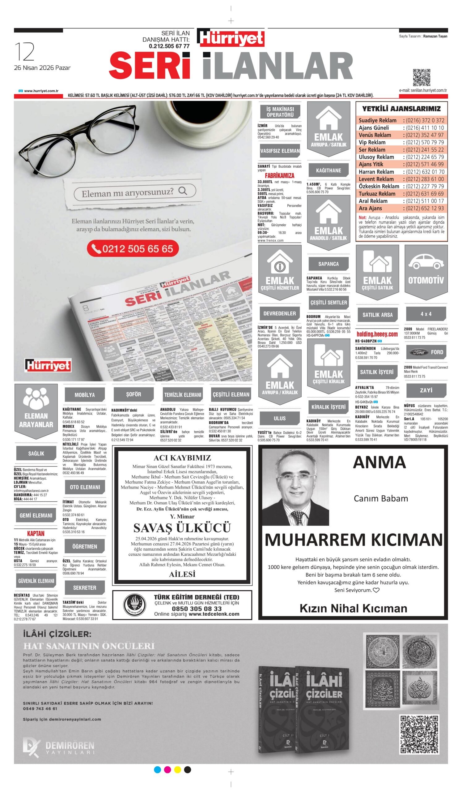 26 Nisan 2026 Hürriyet Gazetesi vefat, başsağlığı ve anma ilanları