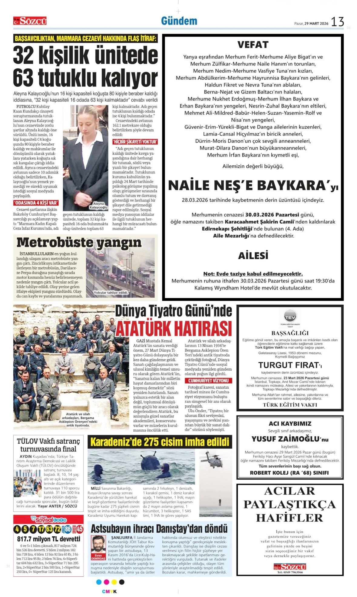 29 Mart 2026 Sözcü Gazetesi vefat, başsağlığı ve anma ilanları. İlan vermek için 0533 504 01 01 numaralı hattı arayın.