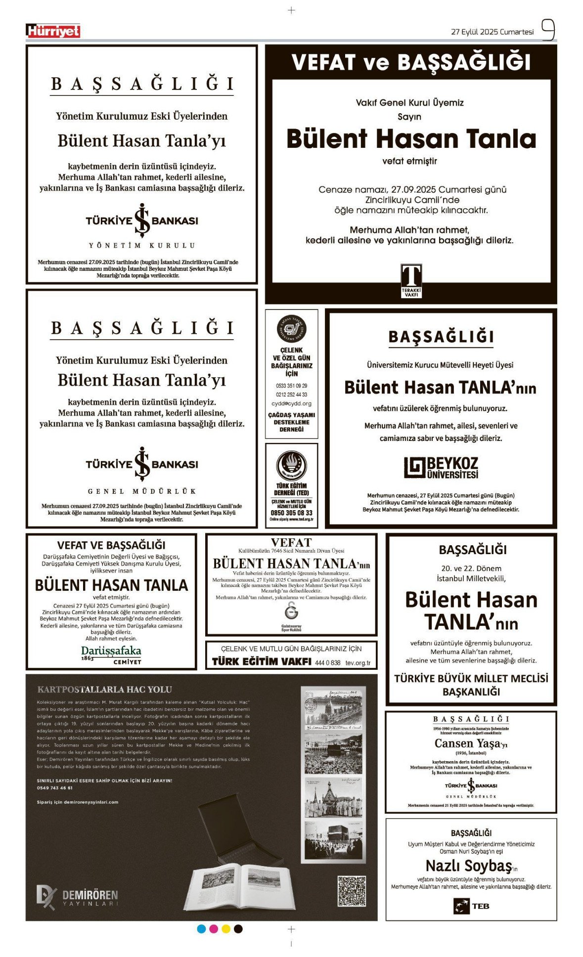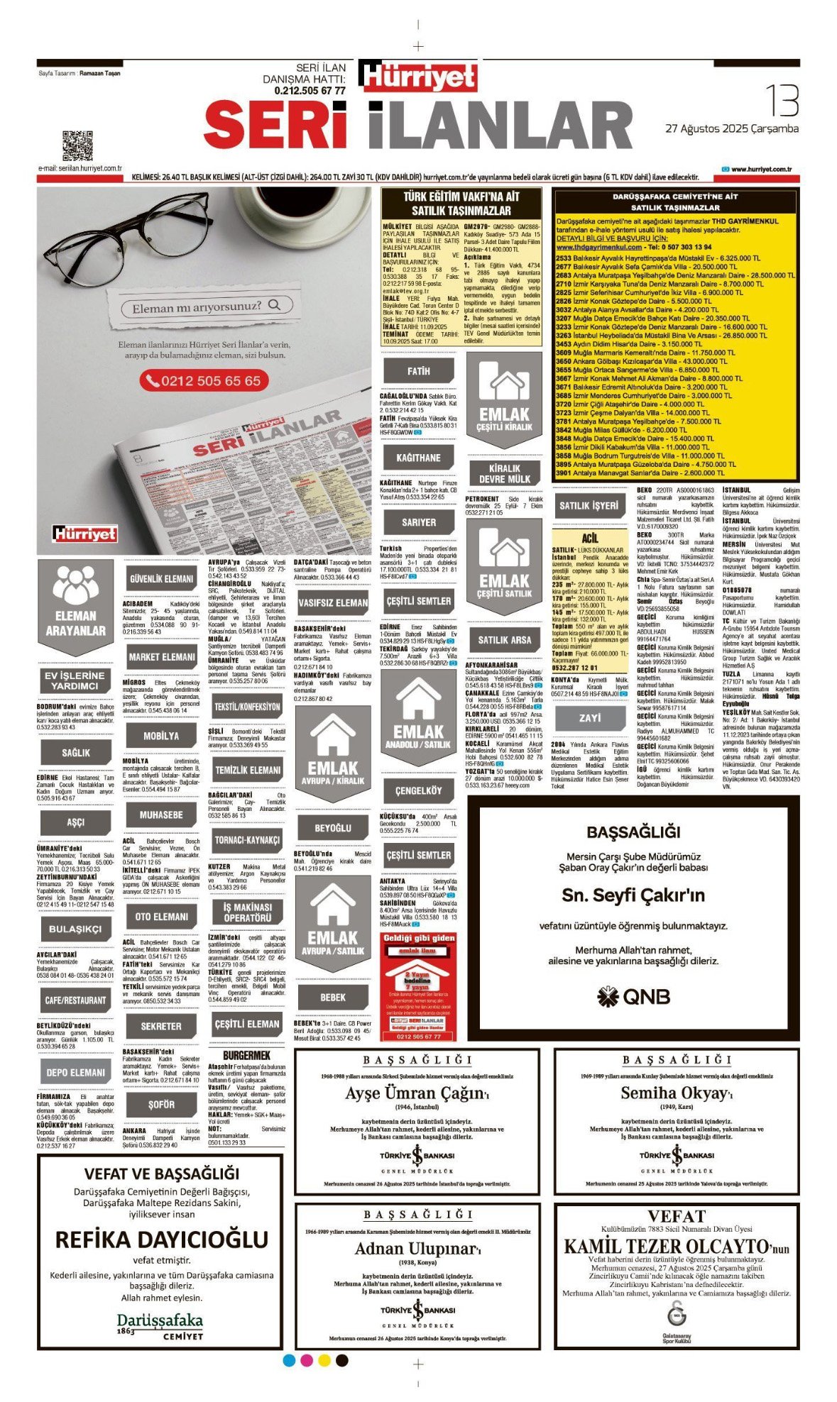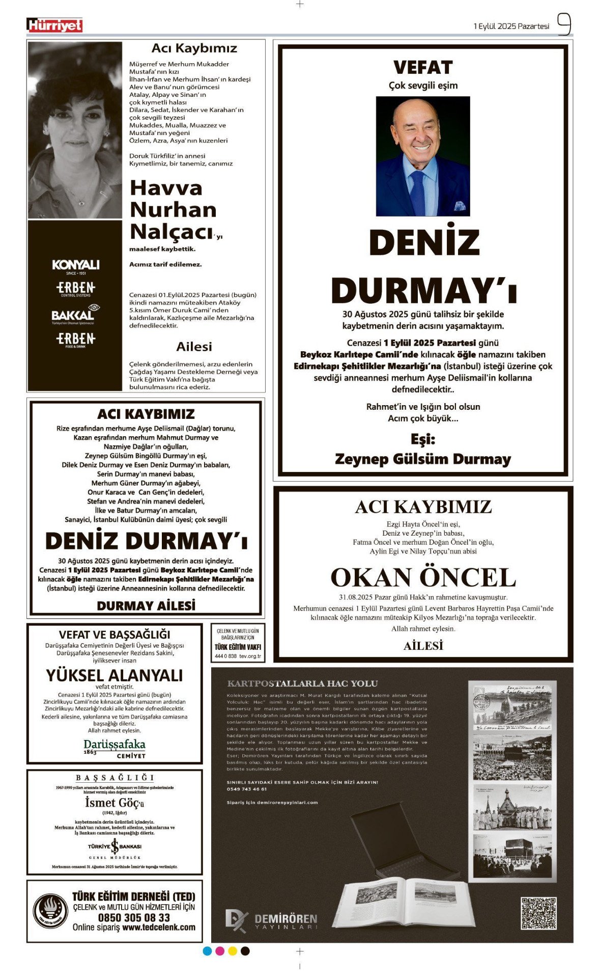 Hürriyet, Sözcü, Cumhuriyet Bugünkü vefat ilan sayfaları, vefat ilanı vermek ve bilgi almak için 7/24 bize ulaşabilirsiniz.