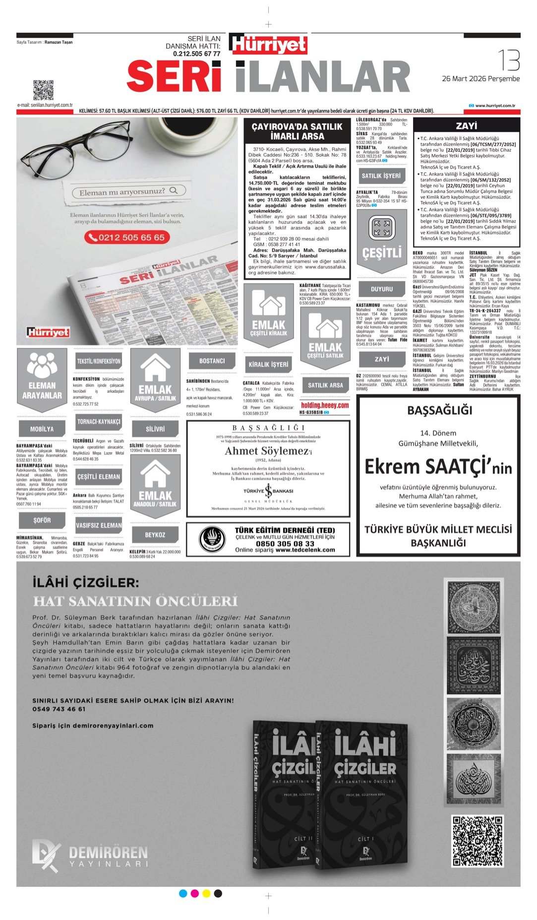 26 Mart 2026 Hürriyet Bugünkü İş İlanları, Hürriyet Eleman, Hürriyet Kayıp İlanı, Hürriyet Seri İlanlar.