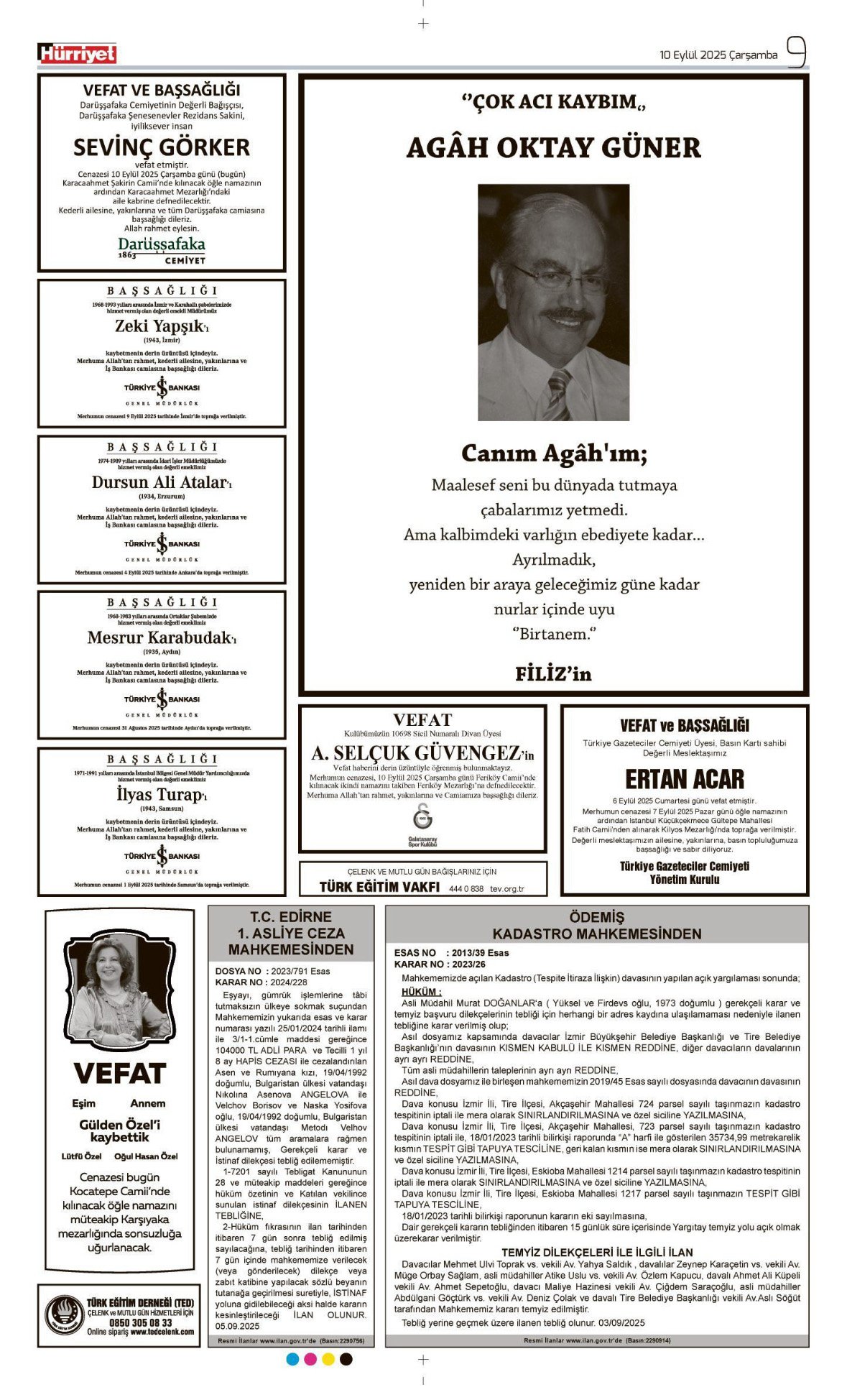 Hürriyet Bugünkü Vefat (Ölüm) – Başsağlığı – Anma – Teşekkür – Mevlit İlanları-10.9.2025