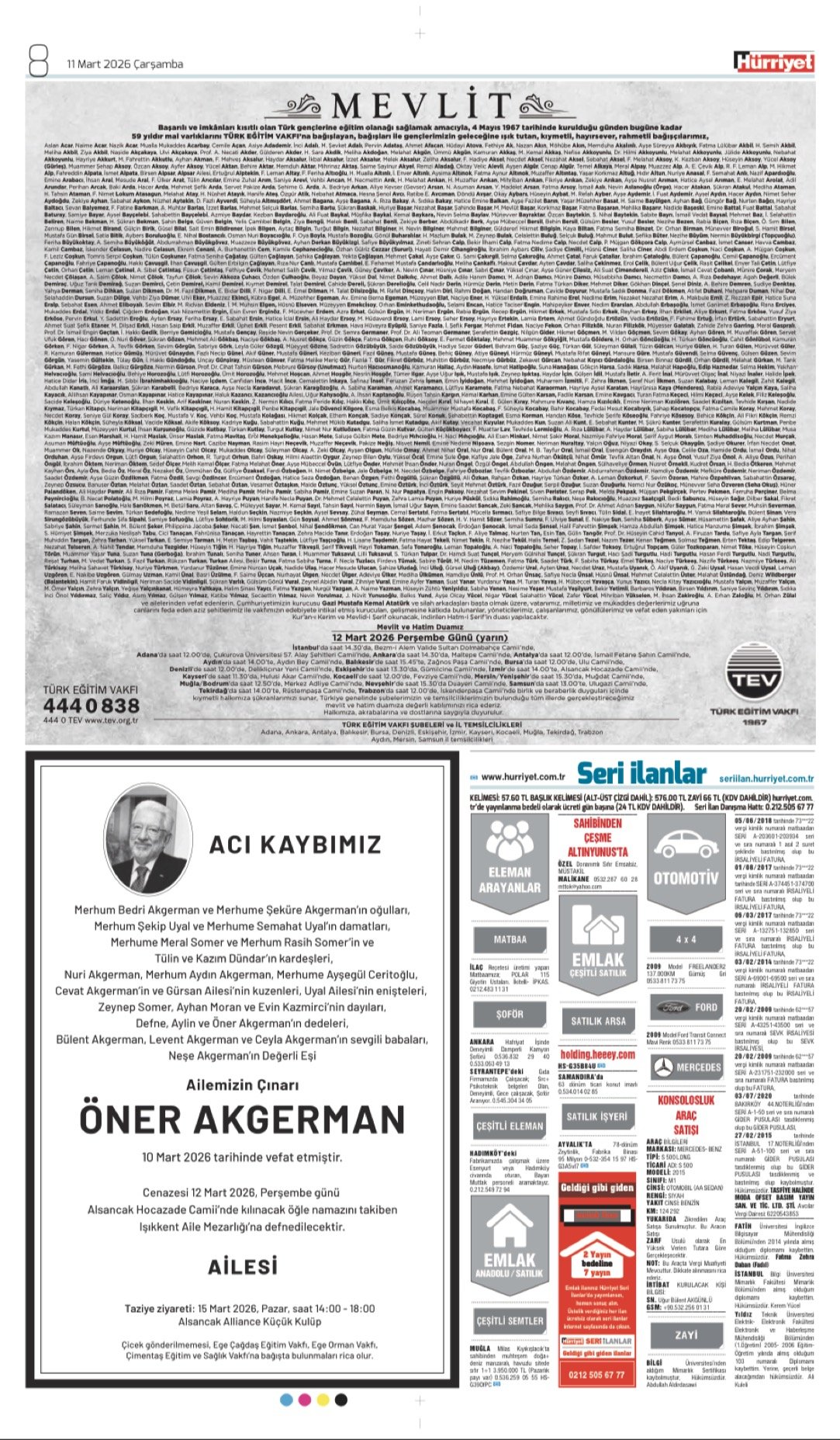 Hürriyet Bugünkü Vefat (Ölüm) – Başsağlığı – Anma – Teşekkür – Mevlit İlanları-11.3.2026