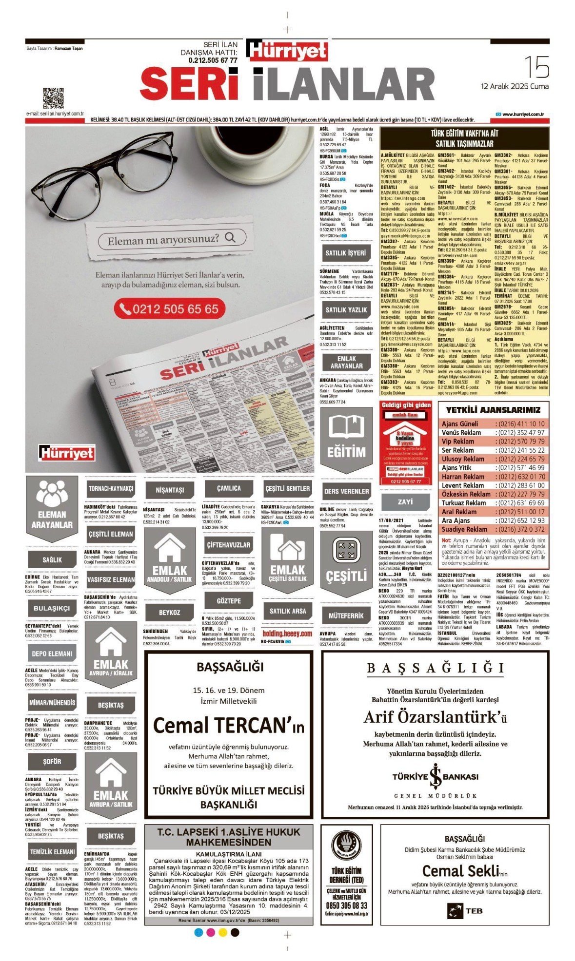 Hürriyet Bugünkü Vefat (Ölüm) – Başsağlığı – Anma – Teşekkür – Mevlit İlanları-12.12.2025