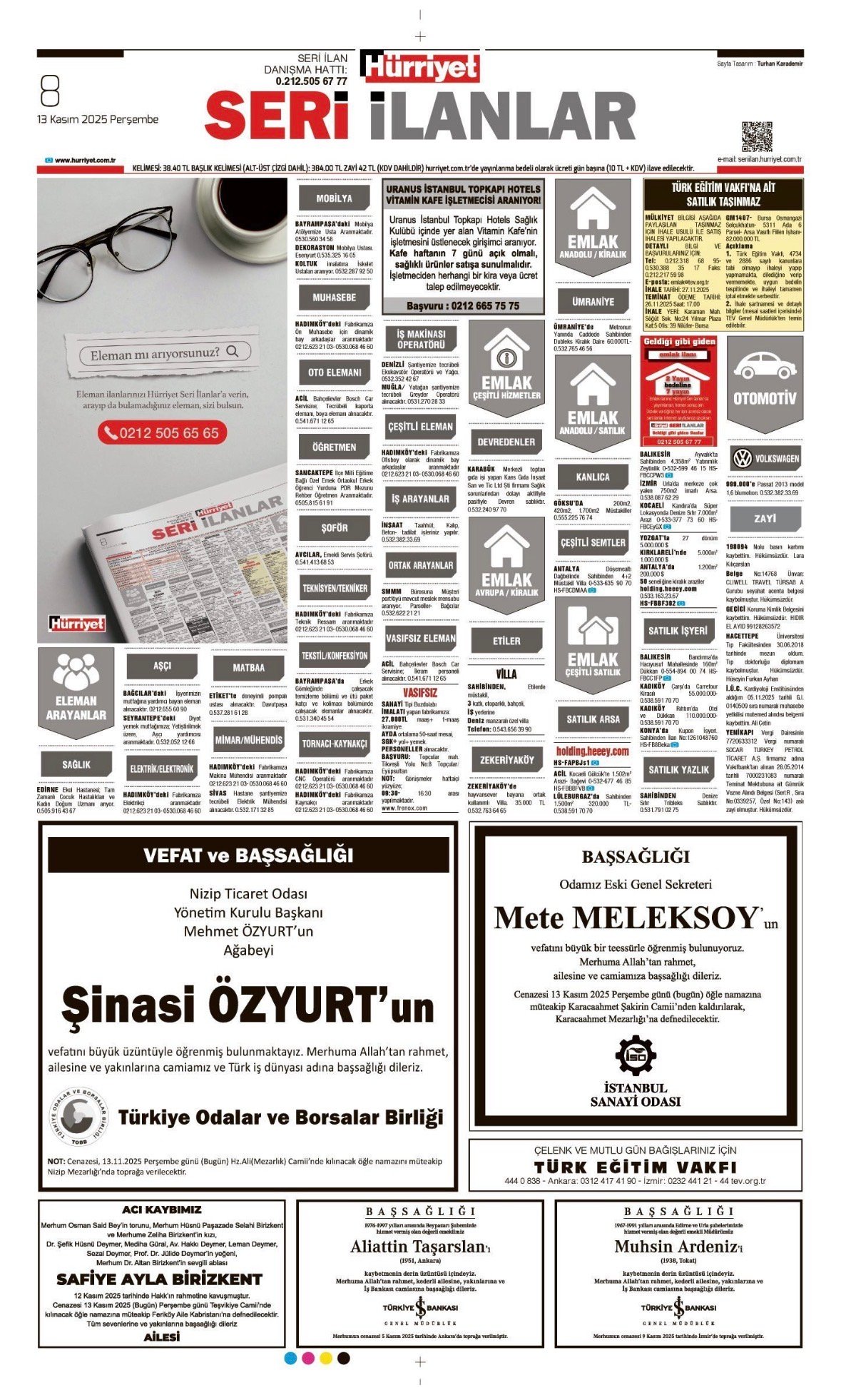 Hürriyet Bugünkü Vefat (Ölüm) – Başsağlığı – Anma – Teşekkür – Mevlit İlanları-13.11.2025