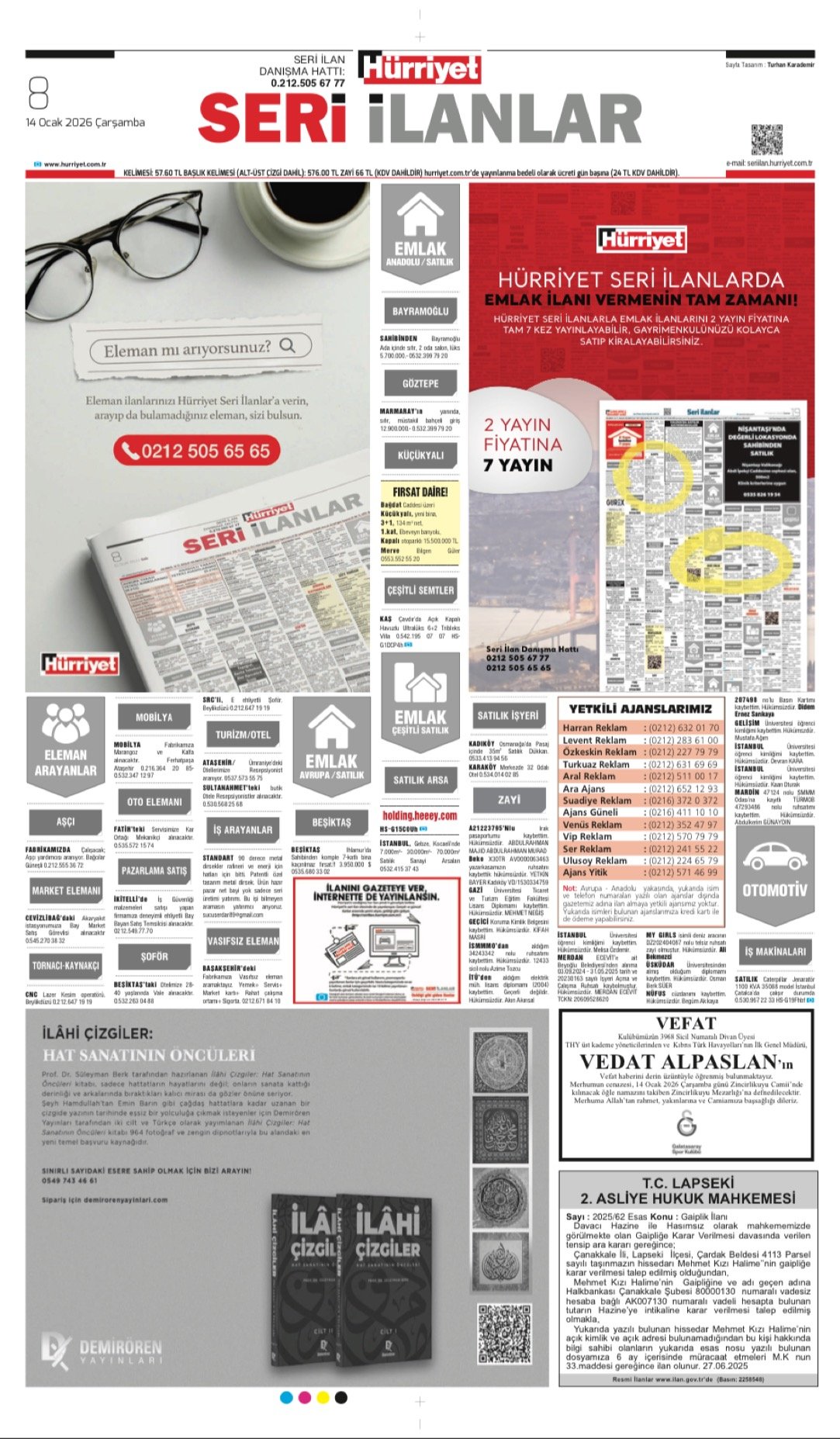 Hürriyet Bugünkü Vefat (Ölüm) – Başsağlığı – Anma – Teşekkür – Mevlit İlanları-14.1.2026