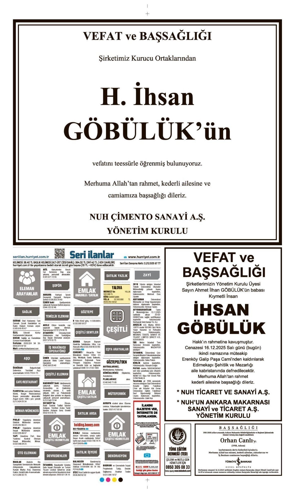 Hürriyet Bugünkü Vefat (Ölüm) – Başsağlığı – Anma – Teşekkür – Mevlit İlanları-16.12.2025