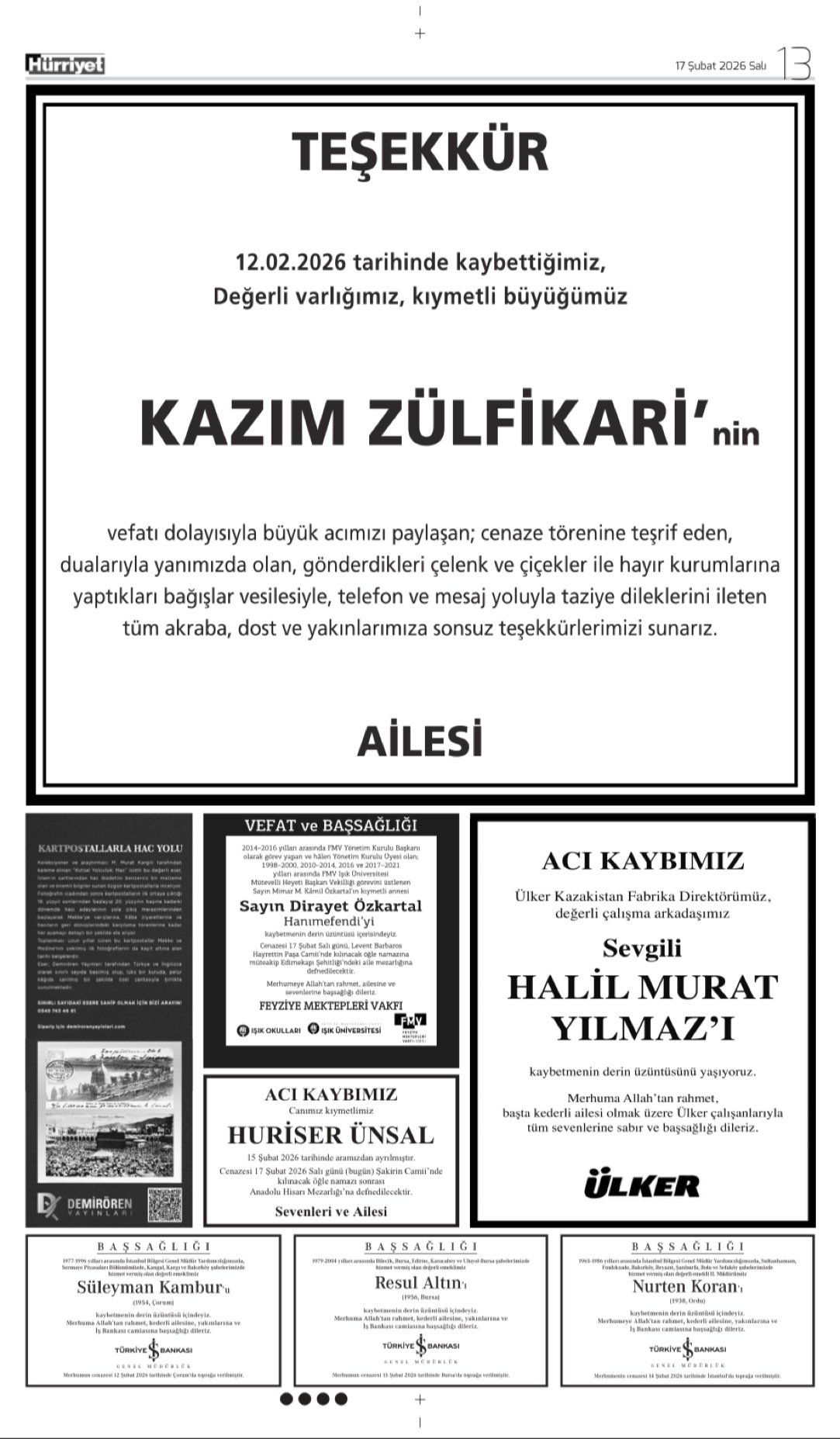 Hürriyet Bugünkü Vefat (Ölüm) – Başsağlığı – Anma – Teşekkür – Mevlit İlanları-17.2.2026