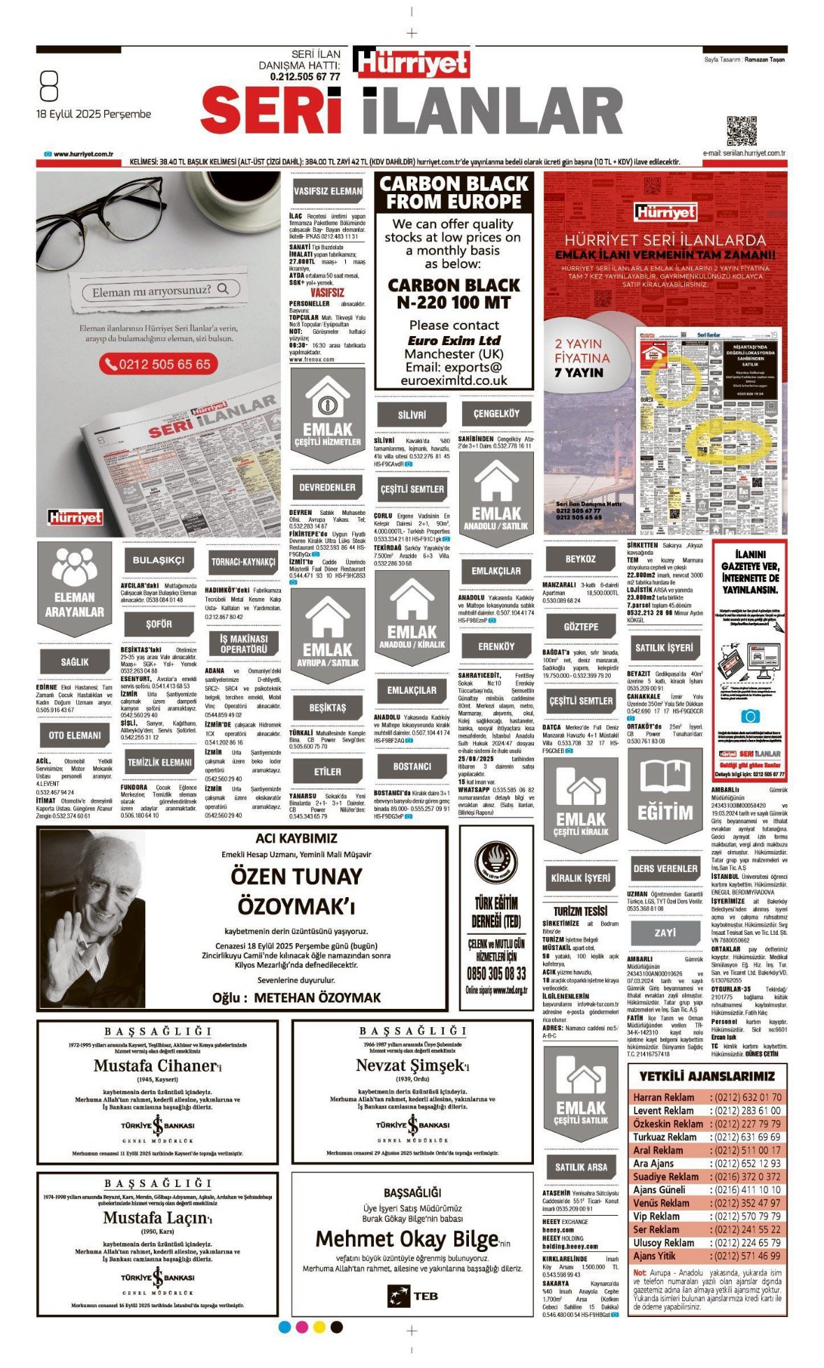 Hürriyet Bugünkü Vefat (Ölüm) – Başsağlığı – Anma – Teşekkür – Mevlit İlanları-18.9.2025