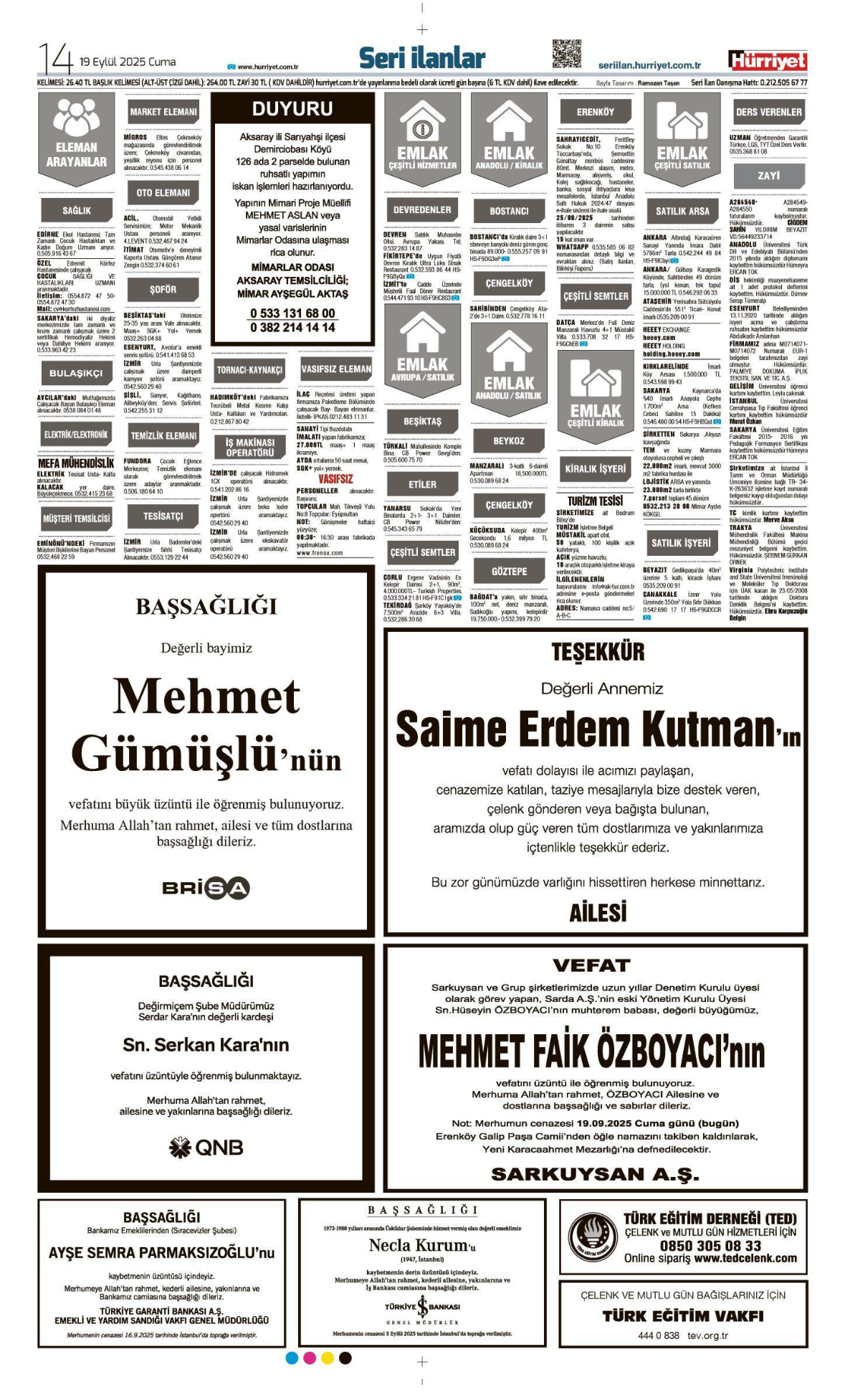 Hürriyet Bugünkü Vefat (Ölüm) – Başsağlığı – Anma – Teşekkür – Mevlit İlanları-19.9.2025