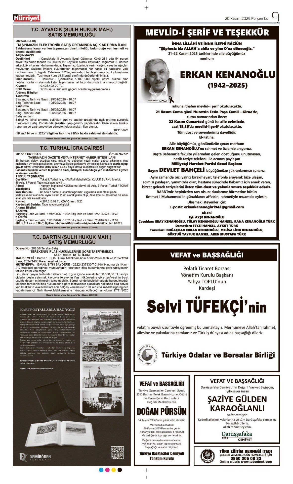 Hürriyet Bugünkü Vefat (Ölüm) – Başsağlığı – Anma – Teşekkür – Mevlit İlanları-20.11.2025