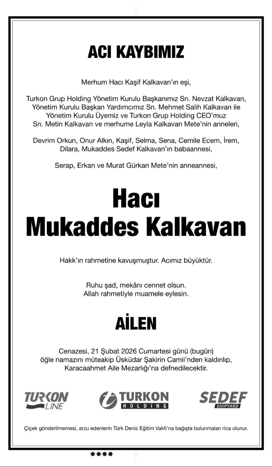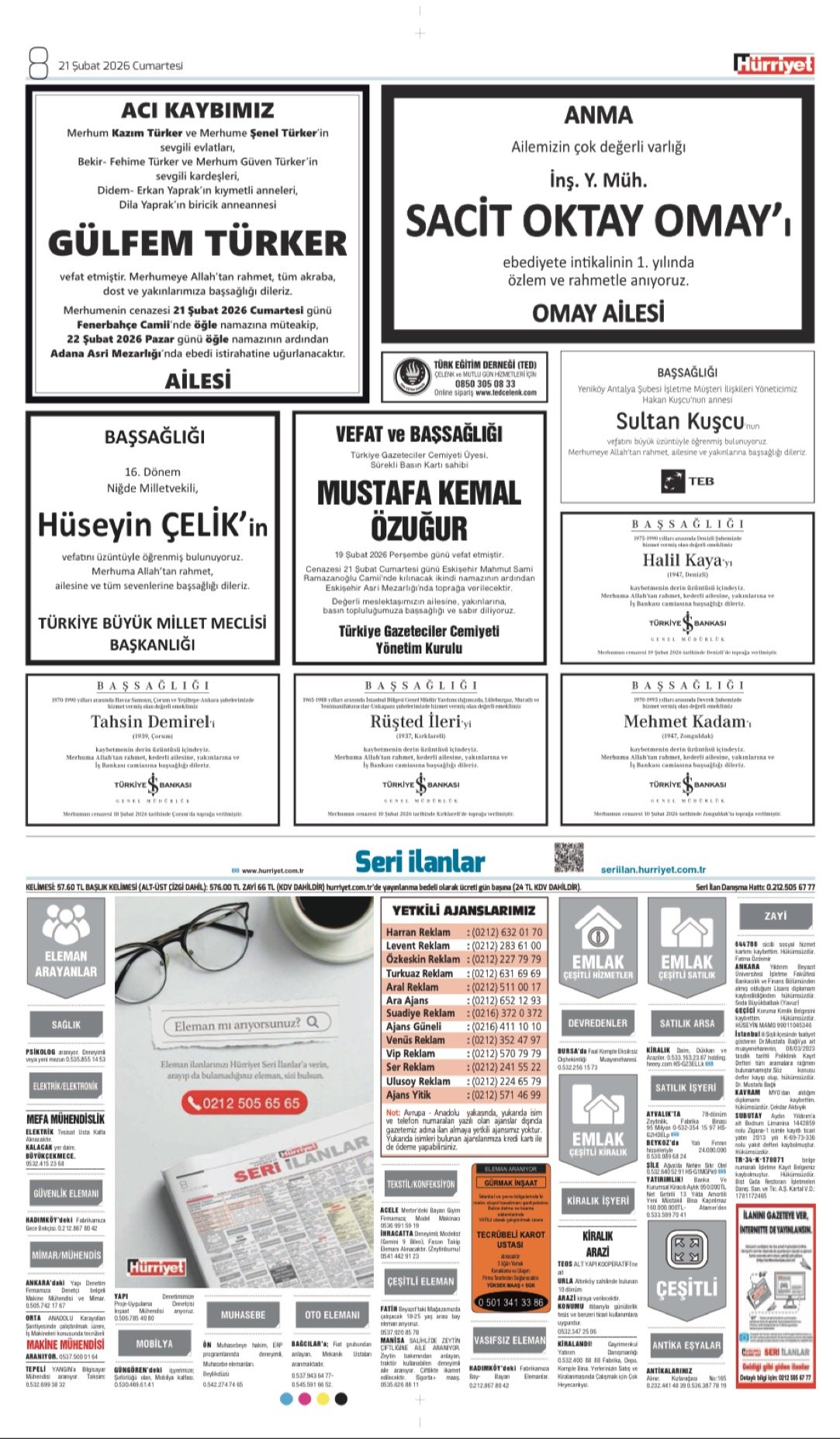 Hürriyet Bugünkü Vefat (Ölüm) – Başsağlığı – Anma – Teşekkür – Mevlit İlanları-21.2.2026