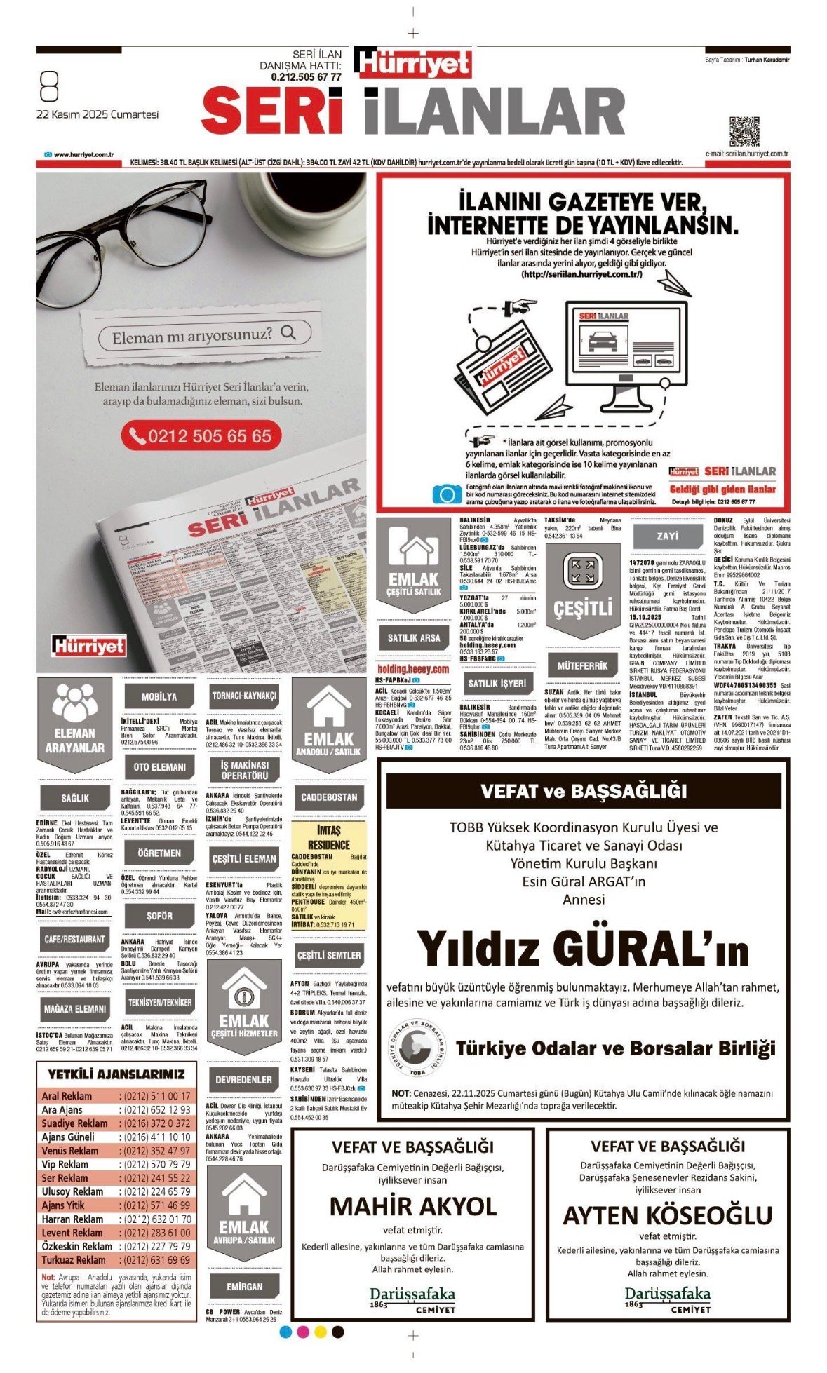 Hürriyet Bugünkü Vefat (Ölüm) – Başsağlığı – Anma – Teşekkür – Mevlit İlanları-22.11.2025
