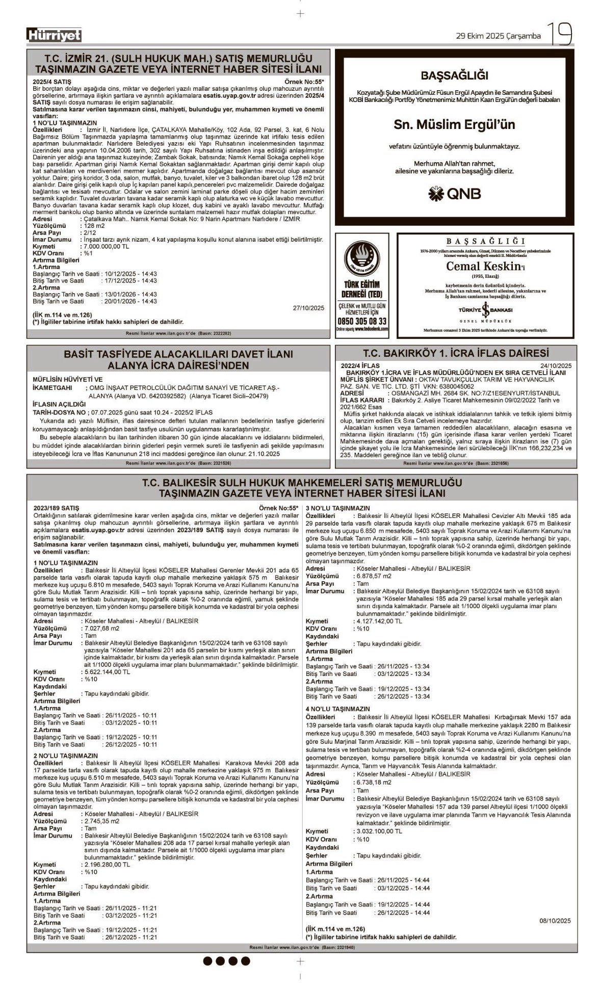 Hürriyet Bugünkü Vefat (Ölüm) – Başsağlığı – Anma – Teşekkür – Mevlit İlanları-29.10.2025