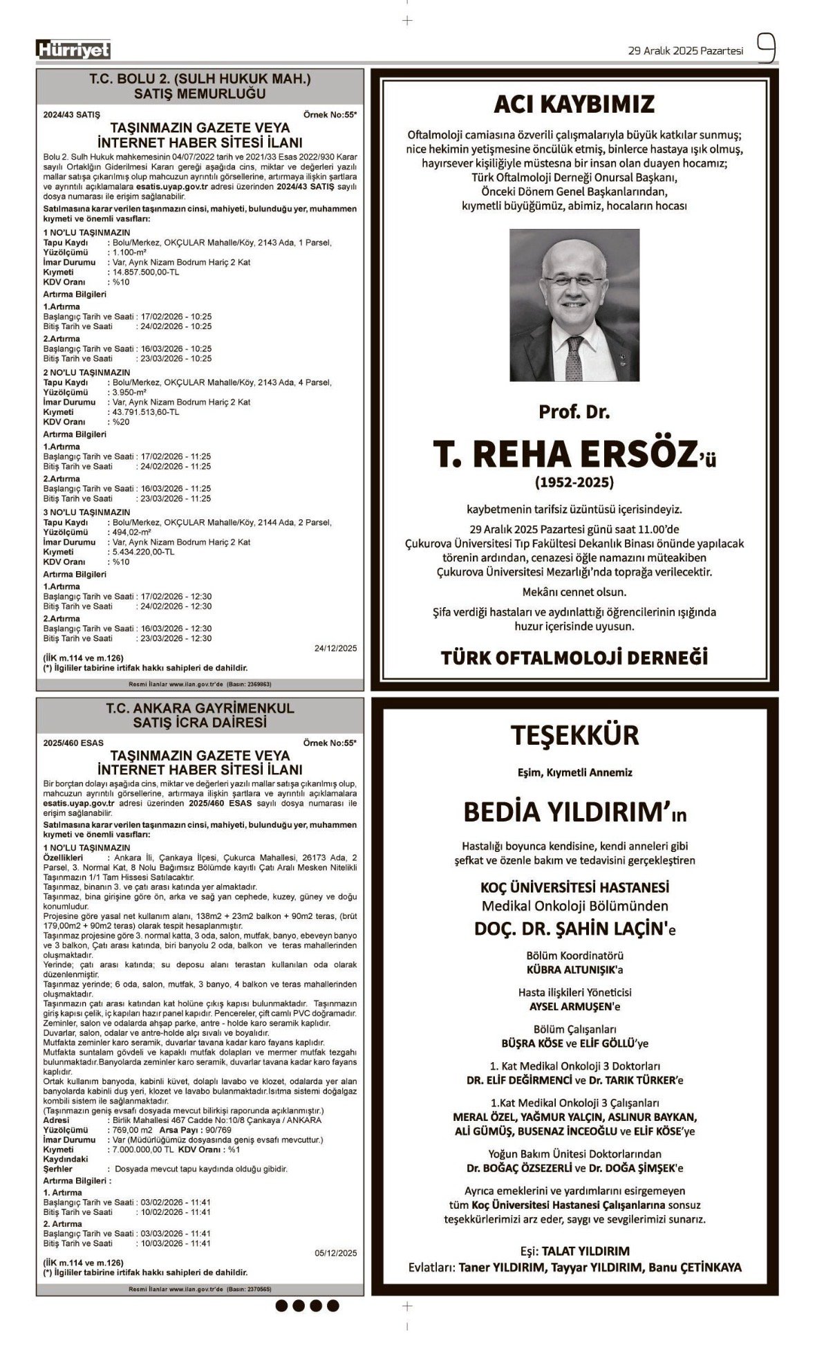 Hürriyet Bugünkü Vefat (Ölüm) – Başsağlığı – Anma – Teşekkür – Mevlit İlanları-29.12.2025