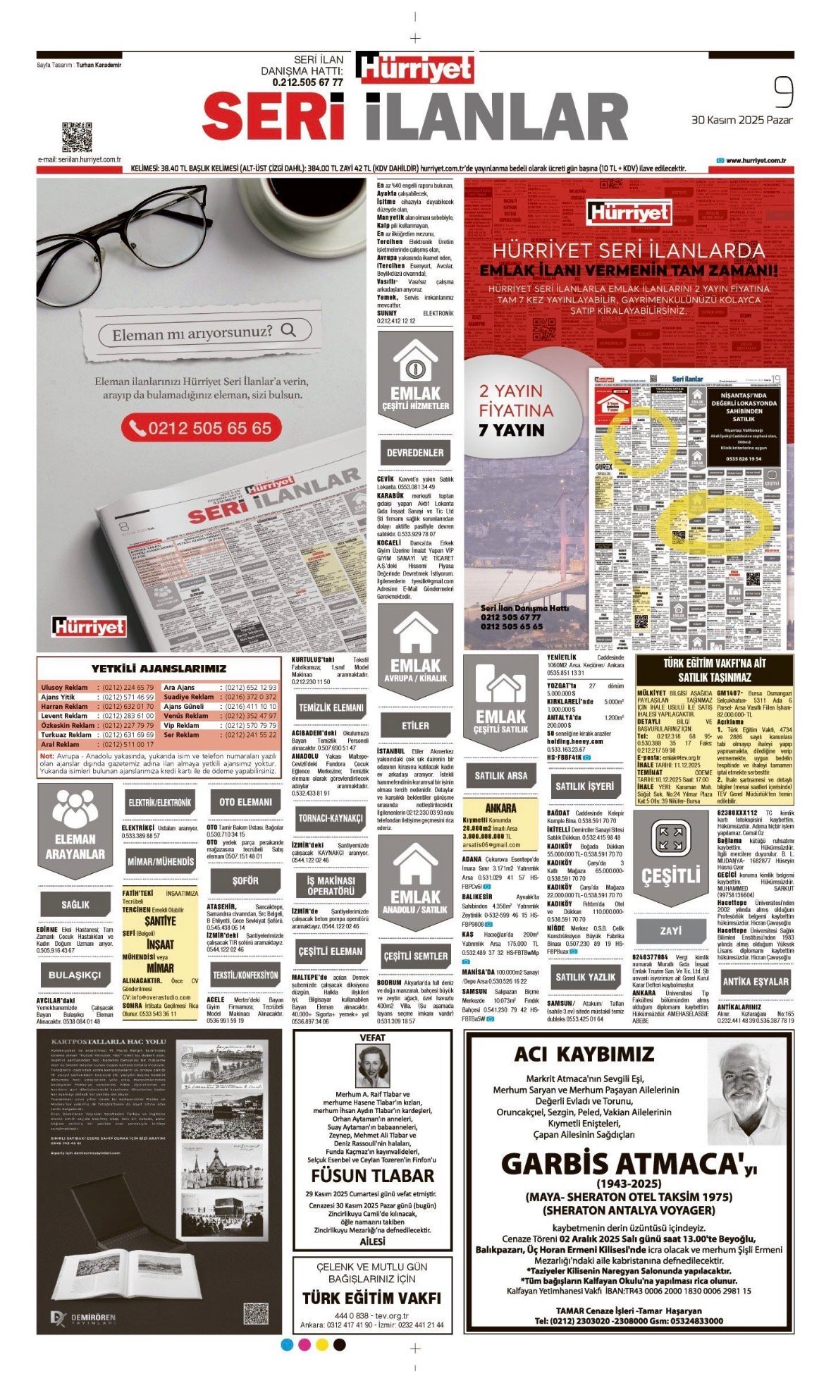 Hürriyet Bugünkü Vefat (Ölüm) – Başsağlığı – Anma – Teşekkür – Mevlit İlanları-30.11.2025