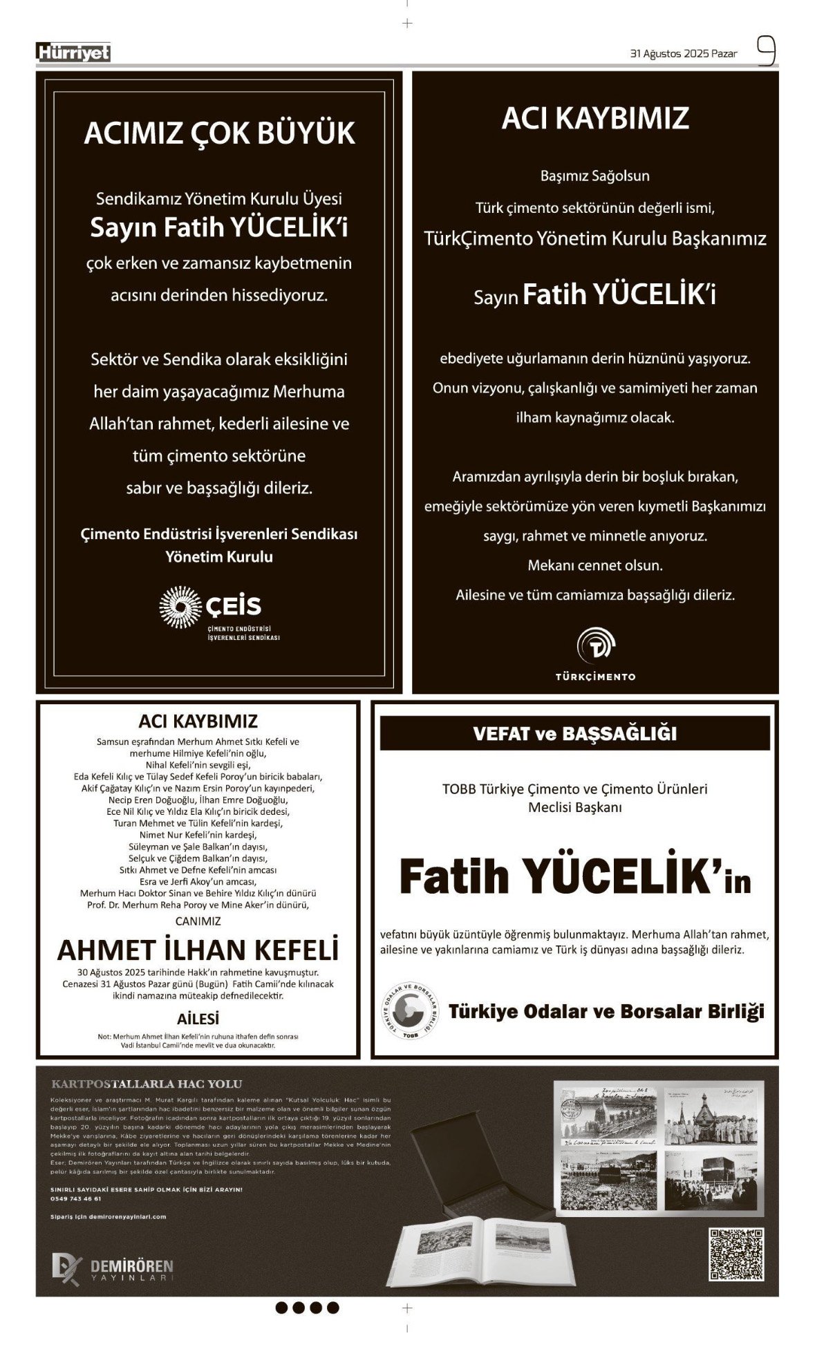 Hürriyet Bugünkü Vefat (Ölüm) – Başsağlığı – Anma – Teşekkür – Mevlit İlanları-31.8.2025