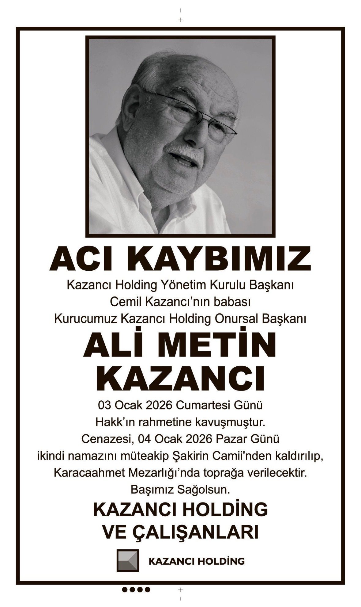 • ALİ METİN KAZANCI – VEFAT İLANI,