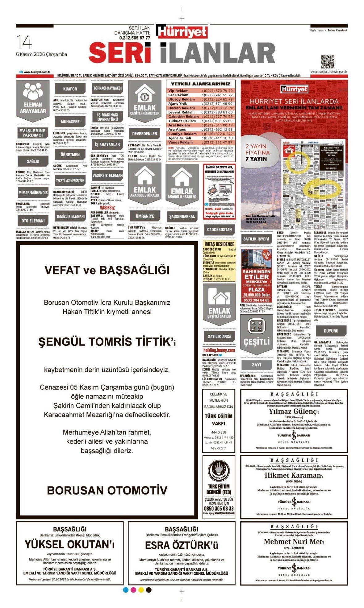 Hürriyet Bugünkü Vefat (Ölüm) – Başsağlığı – Anma – Teşekkür – Mevlit İlanları-5.11.2025