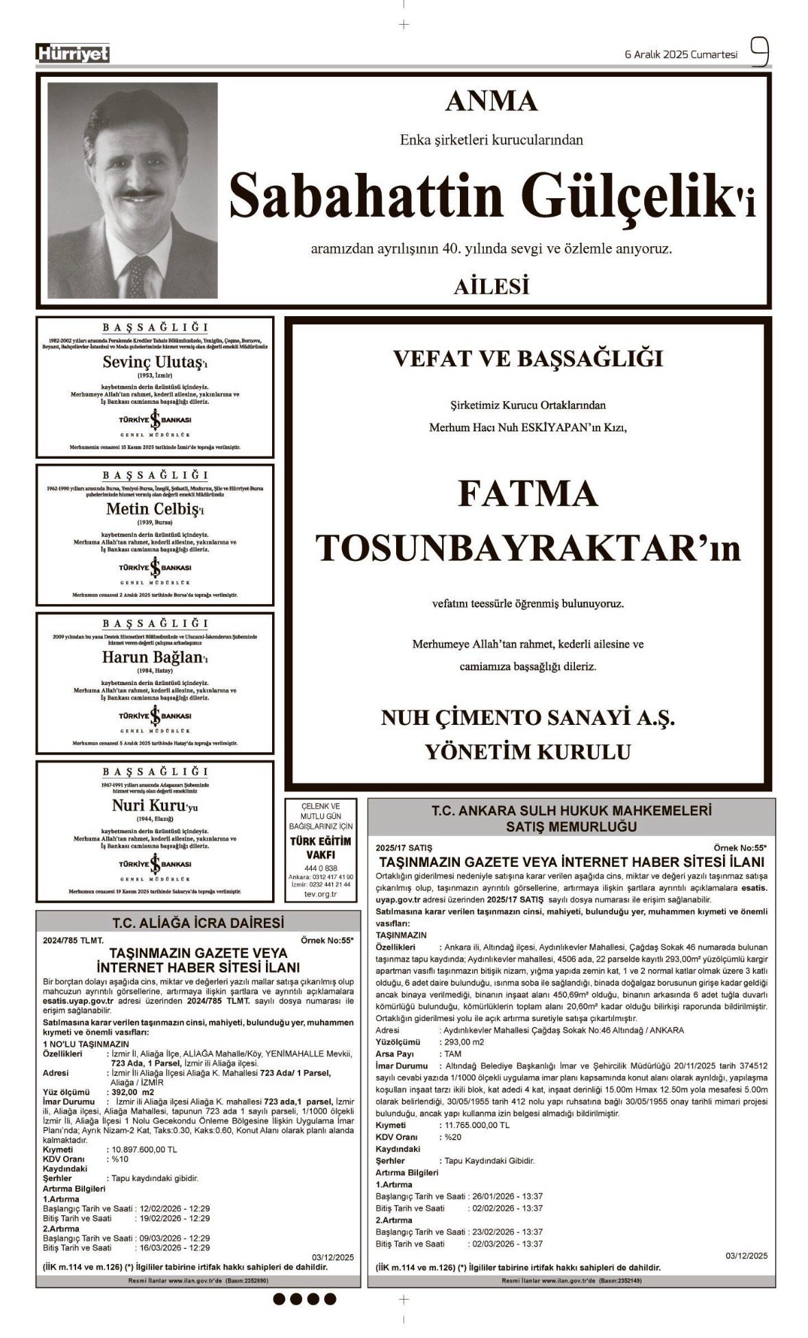 Hürriyet Bugünkü Vefat (Ölüm) – Başsağlığı – Anma – Teşekkür – Mevlit İlanları-6.12.2025