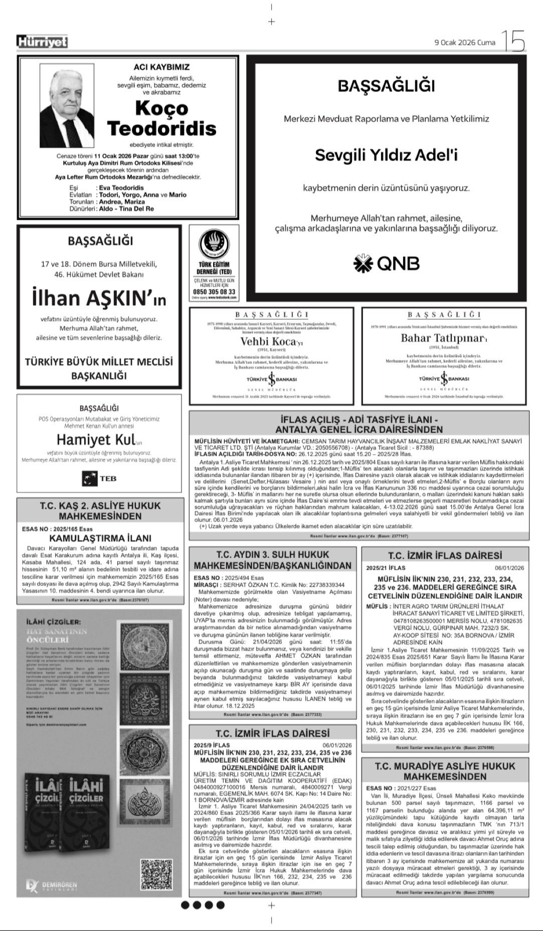 Hürriyet Bugünkü Vefat (Ölüm) – Başsağlığı – Anma – Teşekkür – Mevlit İlanları-9.1.2026