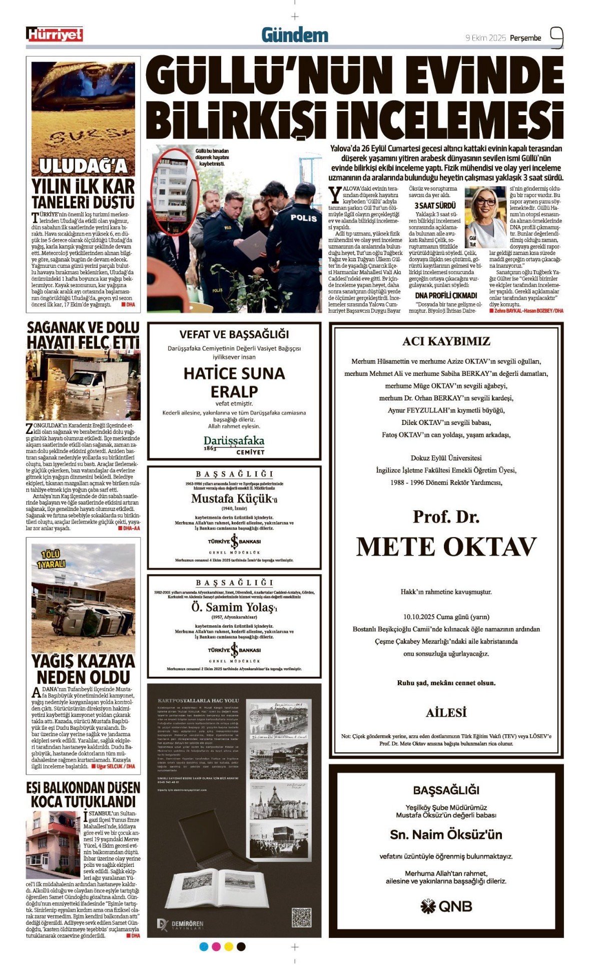 Hürriyet Bugünkü Vefat (Ölüm) – Başsağlığı – Anma – Teşekkür – Mevlit İlanları-9.10.2025