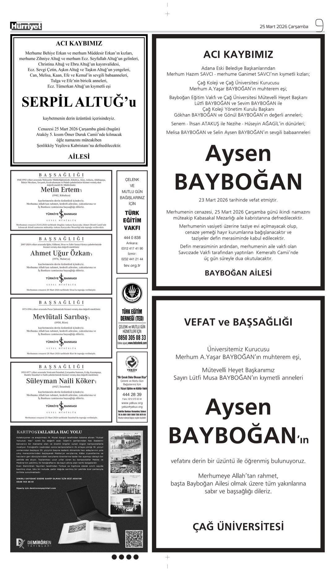 24 Mart 2026-Hürriyet Bugünkü Vefat (Ölüm) – Başsağlığı – Anma – Teşekkür – Mevlit İlanları.