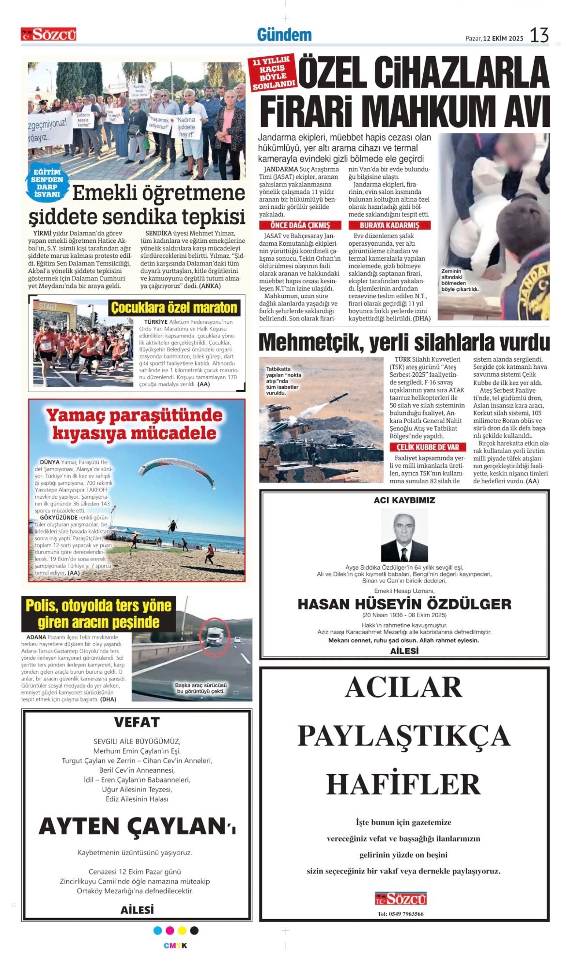 Sözcü Bugünkü Vefat, Başsağlığı, Anma İlanları 12.10.2025;