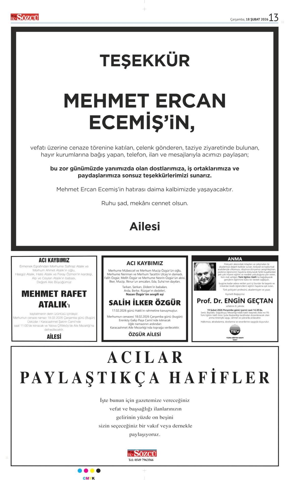 Sözcü Bugünkü Vefat İlan- Başsağlığı İlanı- Anma İlanları ve Arşiv Sayfalar. 18.2.2026