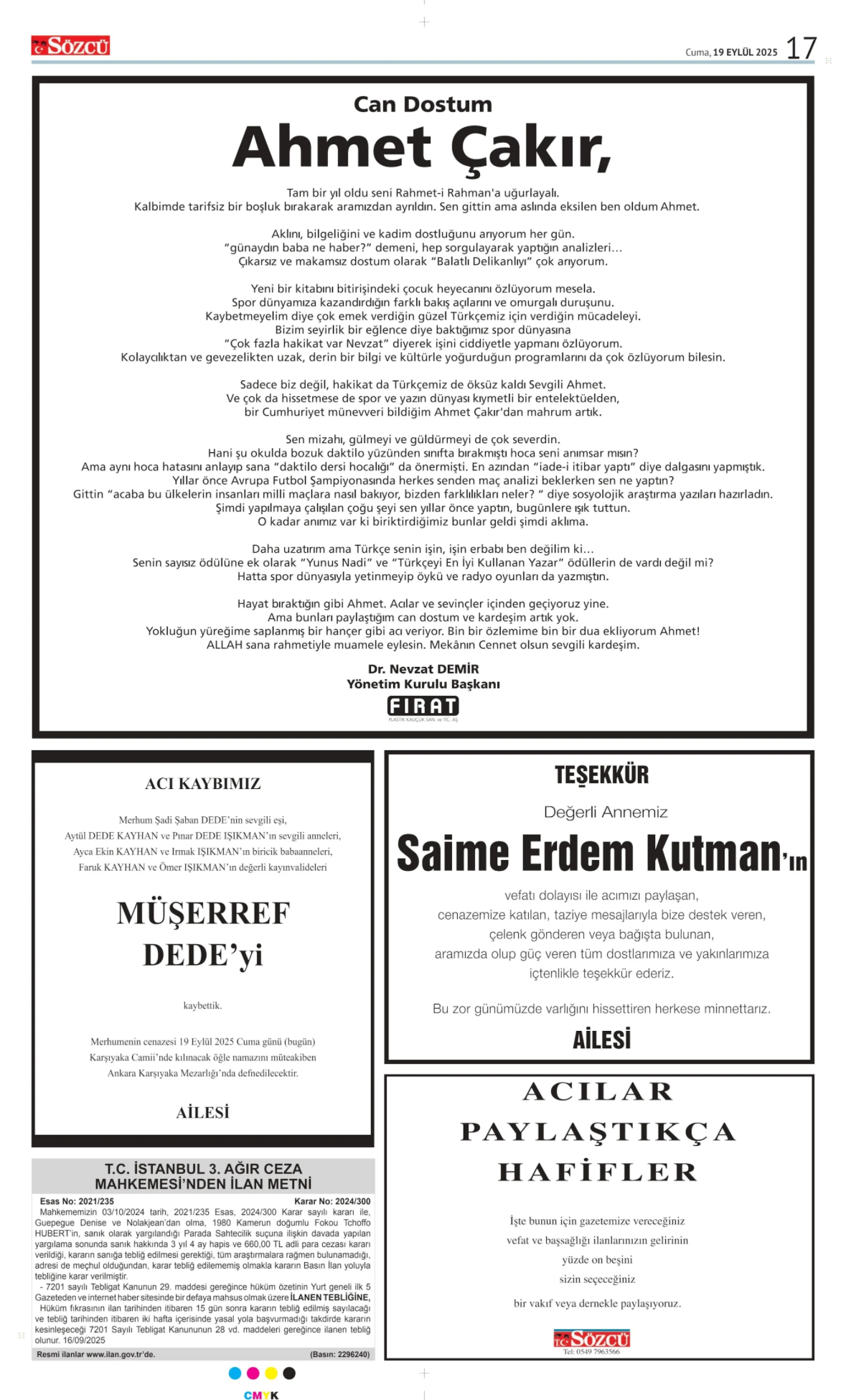 Sözcü Bugünkü Vefat, Başsağlığı, Anma İlanları 19.9.2025;