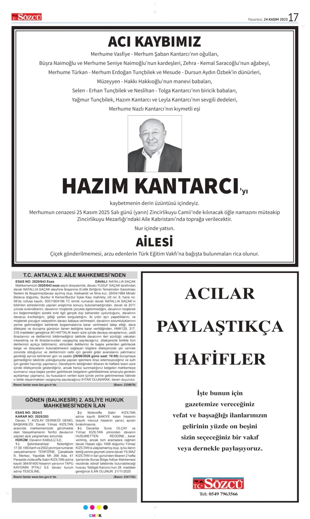 Sözcü Bugünkü Vefat İlan- Başsağlığı İlanı- Anma İlanları ve Arşiv Sayfalar. 21.11.2025