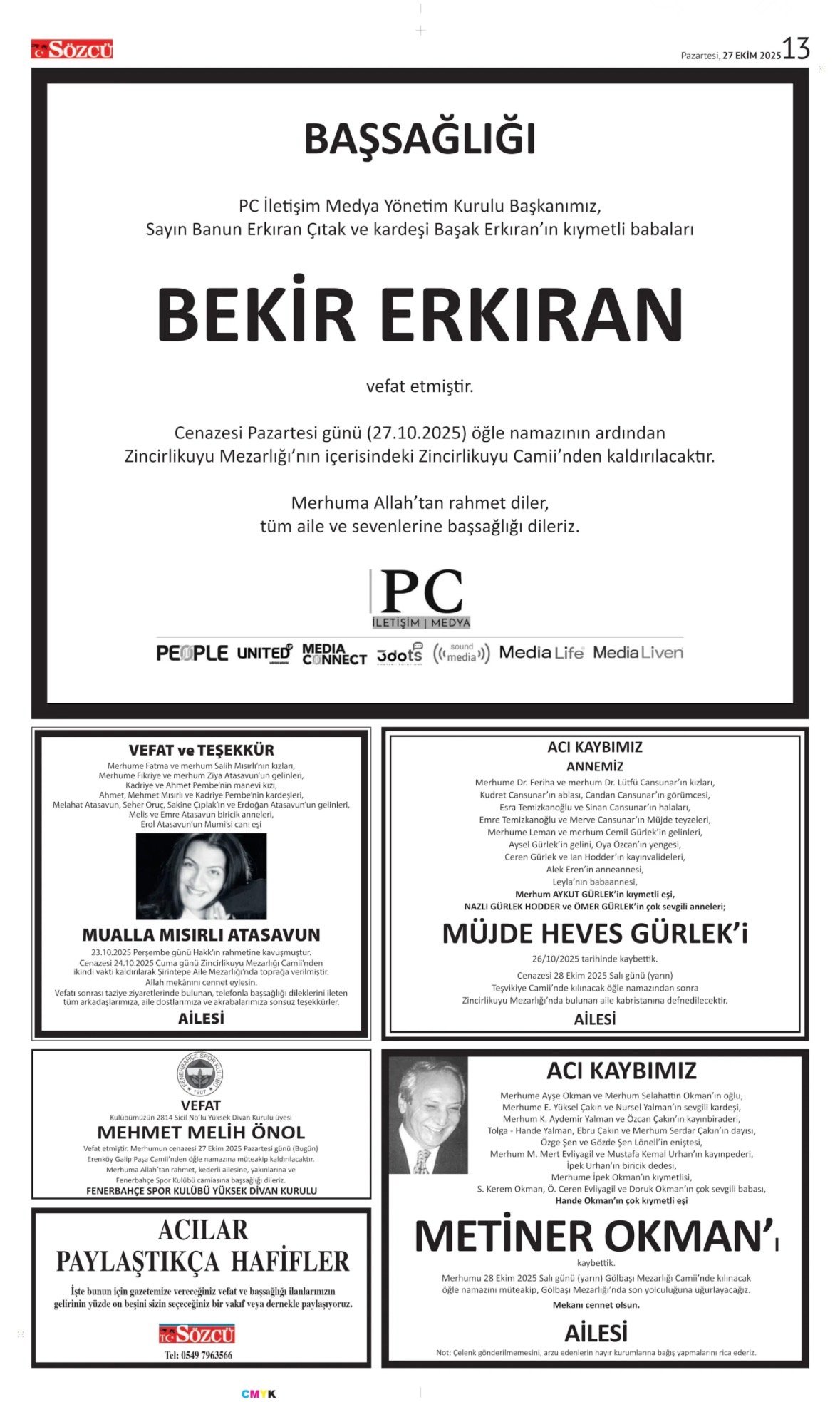 Sözcü Bugünkü Vefat İlan- Başsağlığı İlanı- Anma İlanları ve Arşiv Sayfalar. 27.10.2025