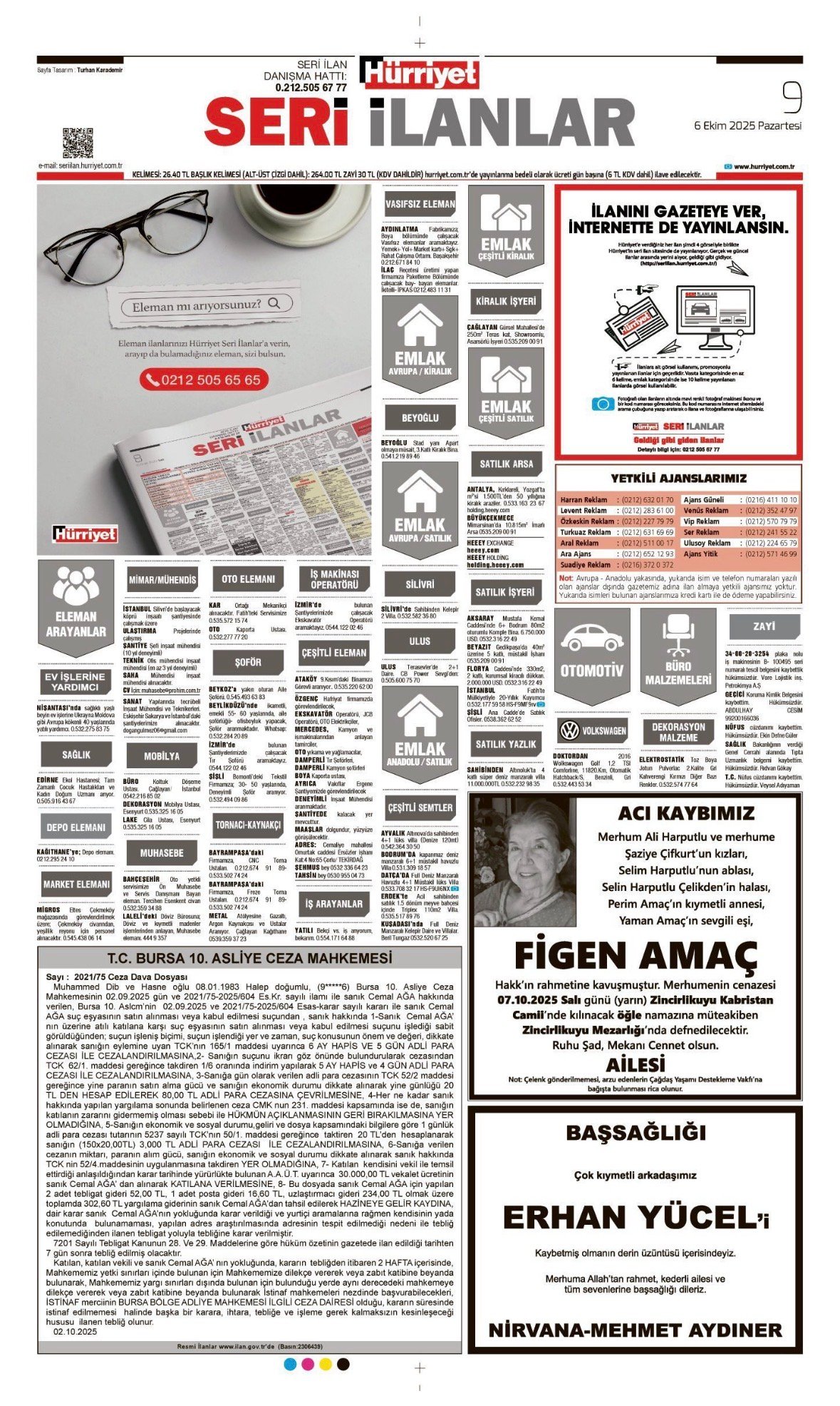 Hürriyet Bugünkü Vefat (Ölüm) – Başsağlığı – Anma – Teşekkür – Mevlit İlanları-6.10.2025