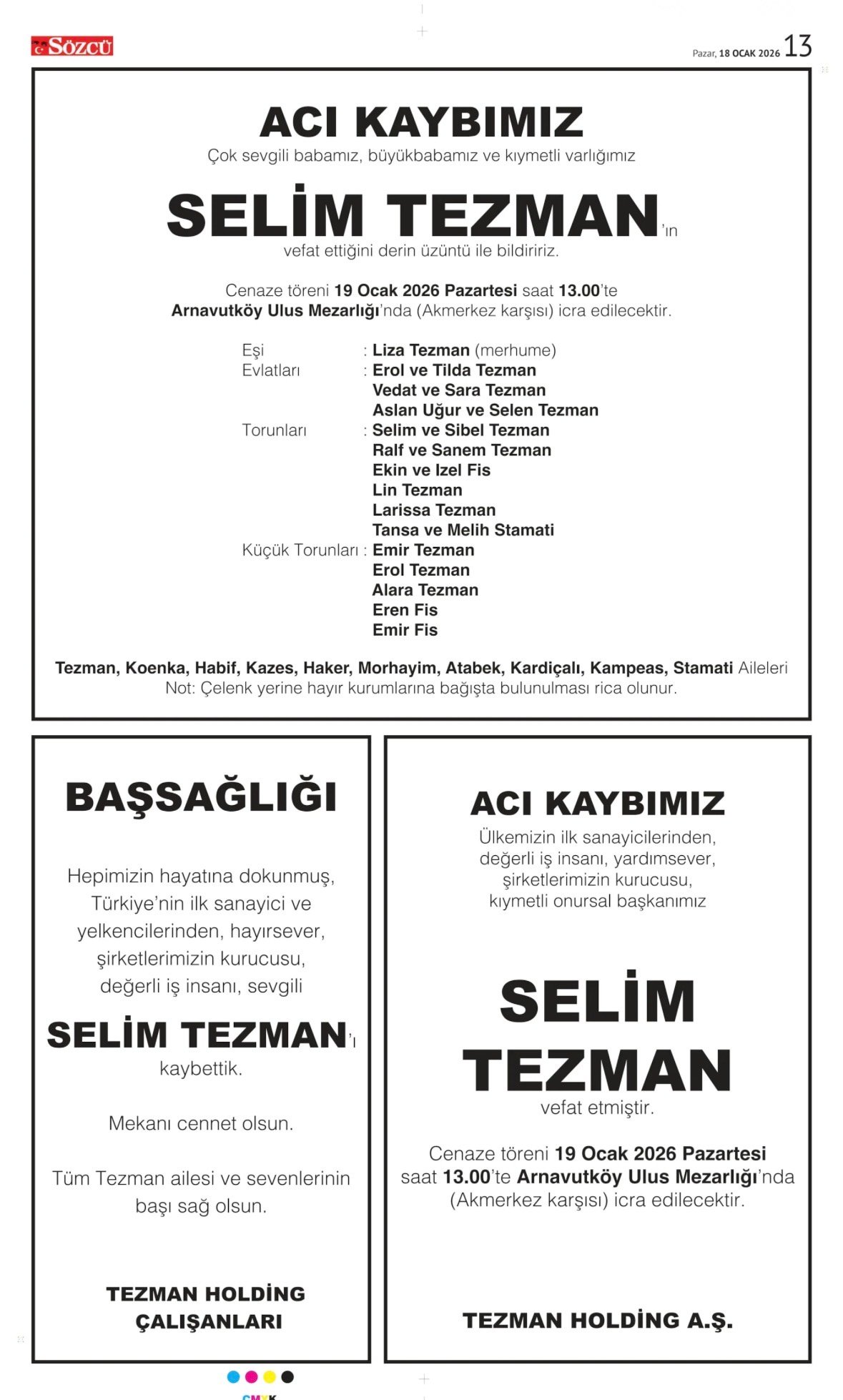 Sözcü Bugünkü Vefat İlan- Başsağlığı İlanı- Anma İlanları ve Arşiv Sayfalar. 17.1.2026