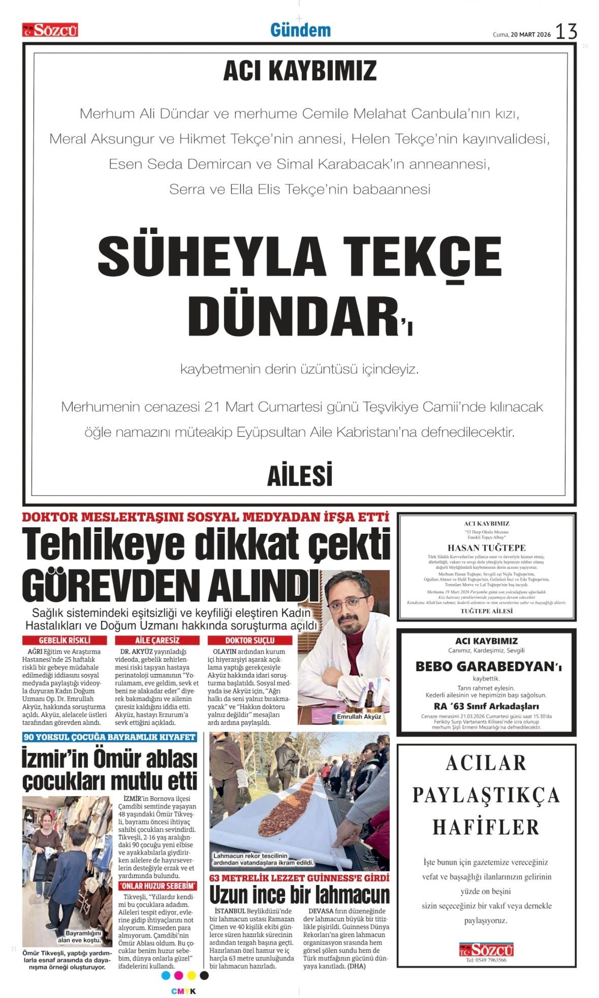 20 Mart 2026 Sözcü Gazetesi vefat, başsağlığı ve anma ilanları. İlan vermek için 0533 504 01 01 numaralı hattı arayın.
