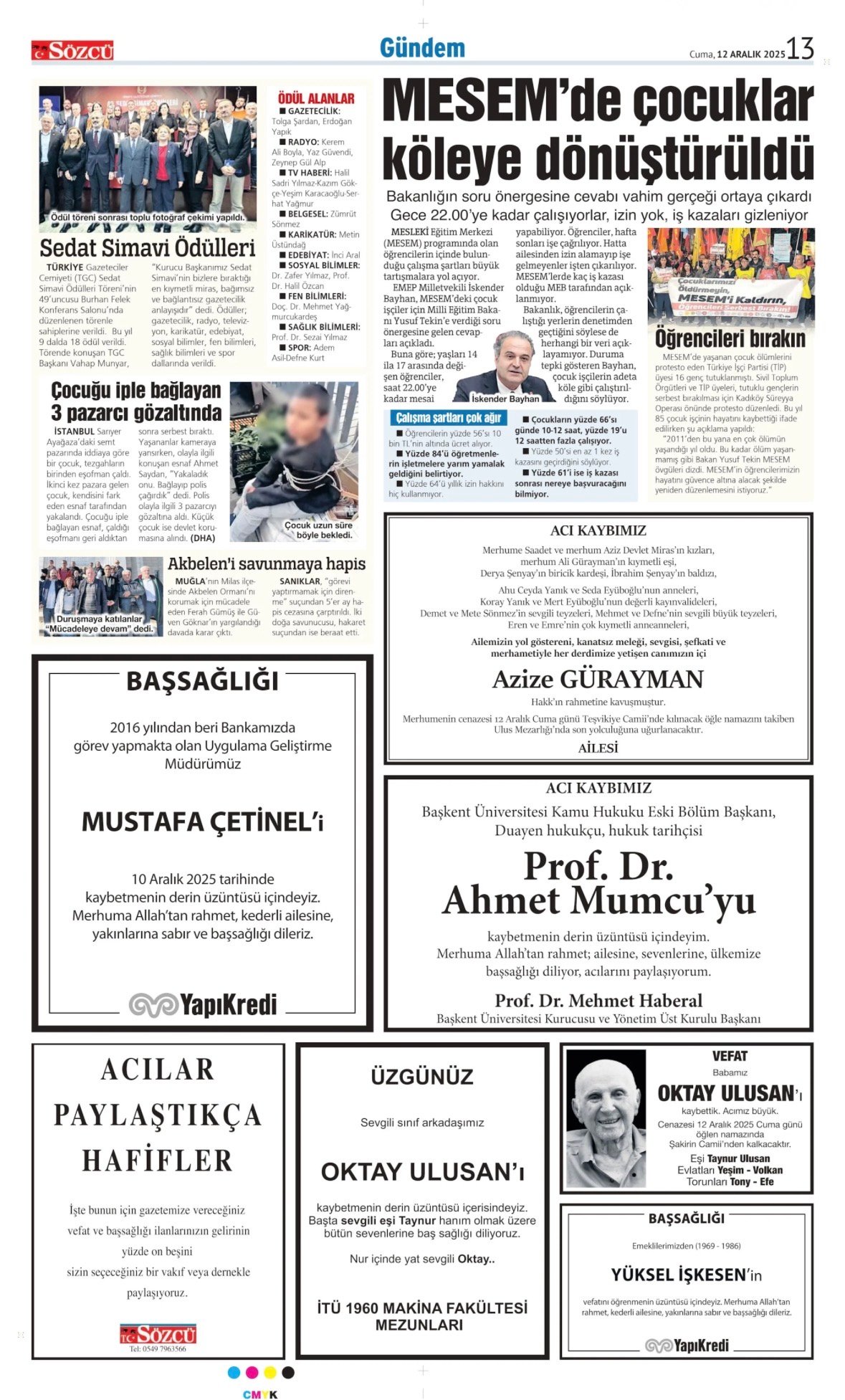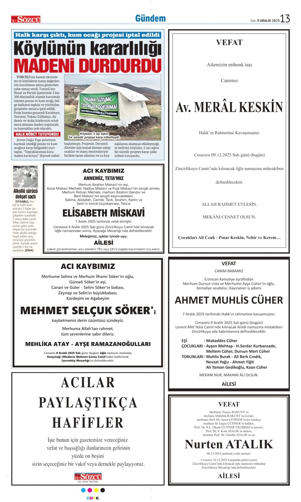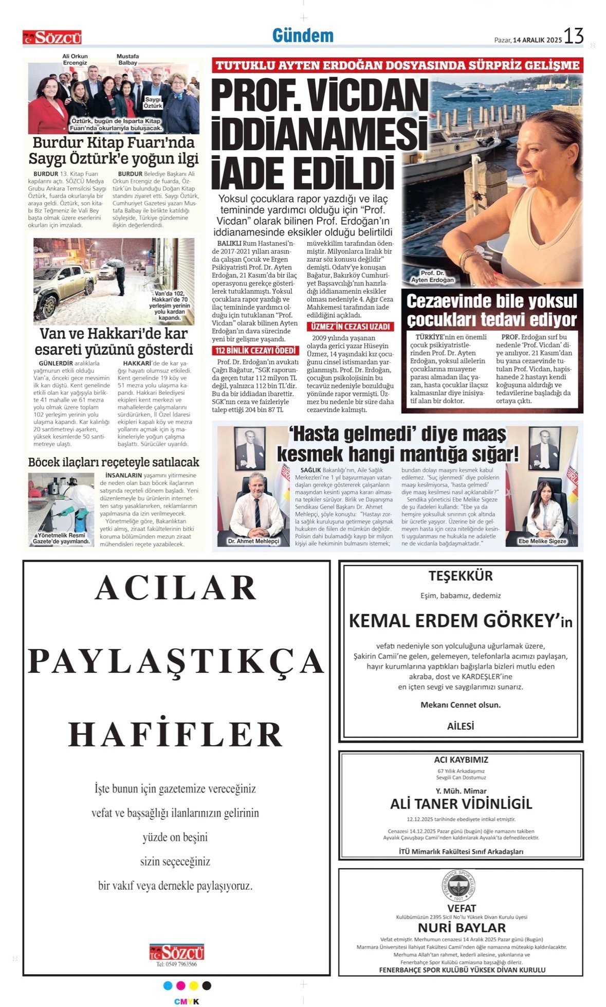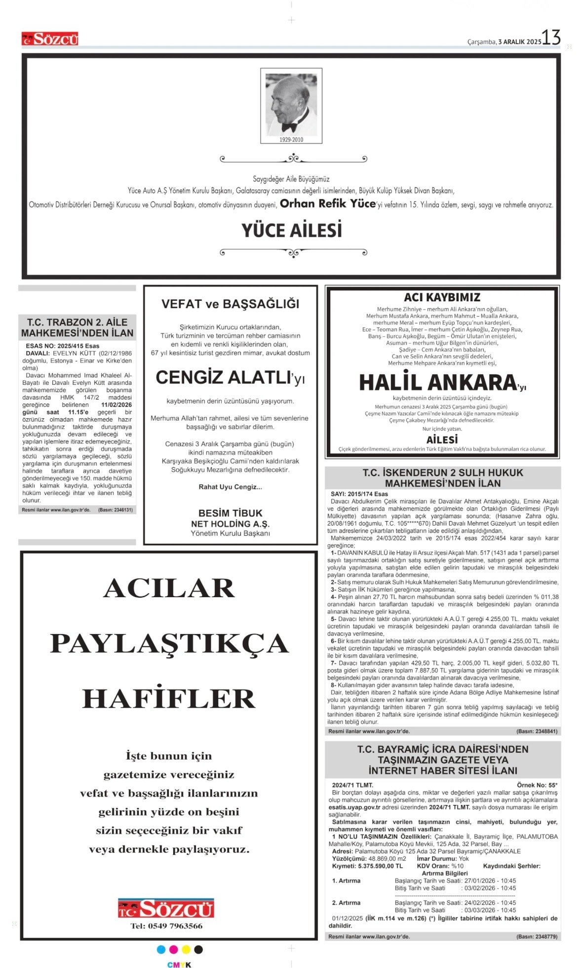 Sözcü Bugünkü Vefat İlan- Başsağlığı İlanı- Anma İlanları ve Arşiv Sayfalar. 13.12.2025