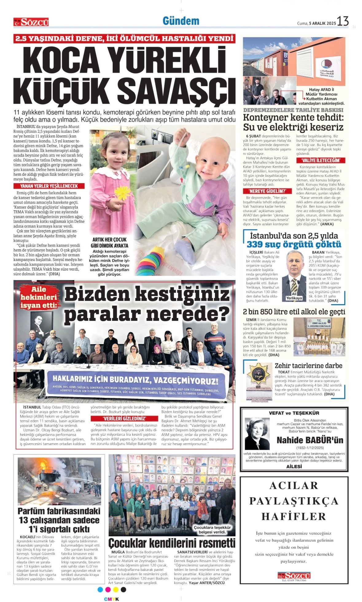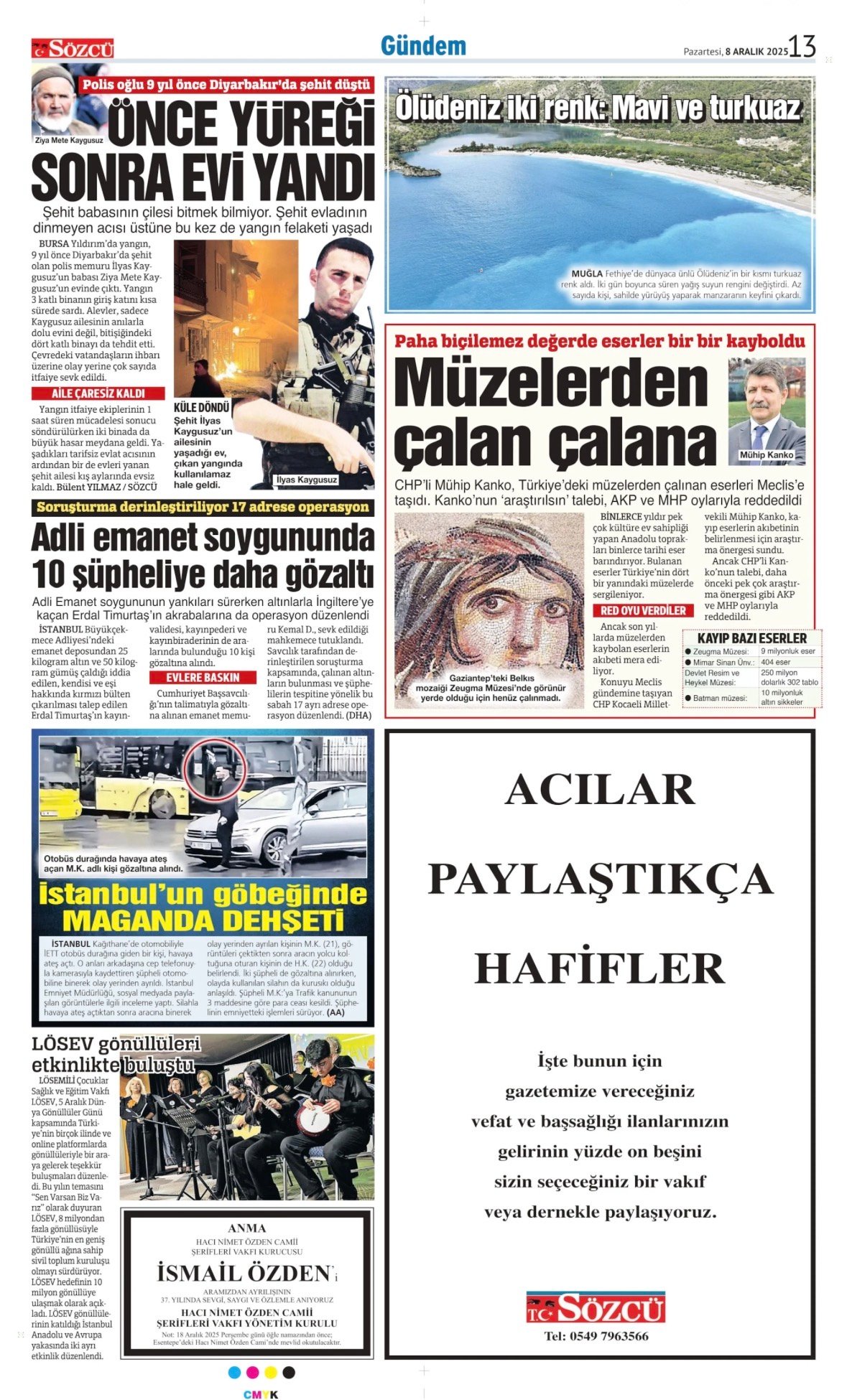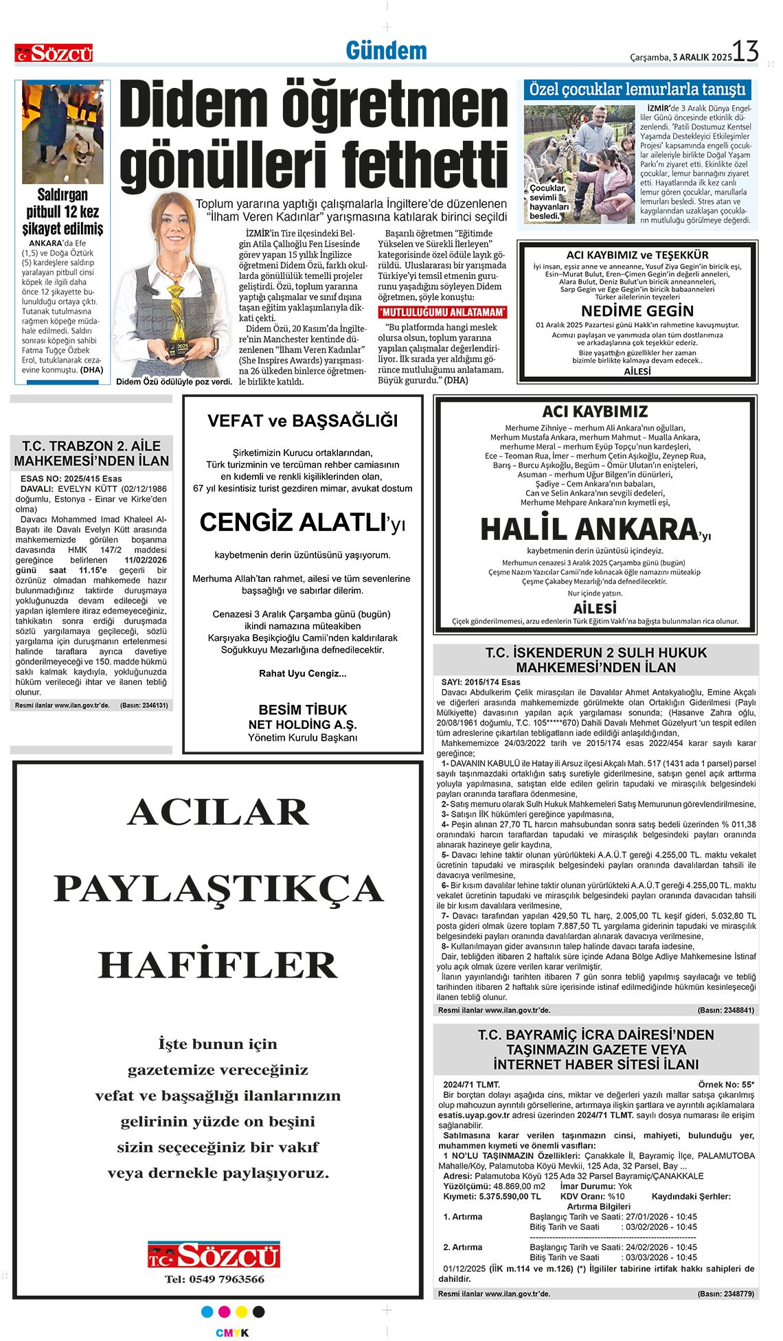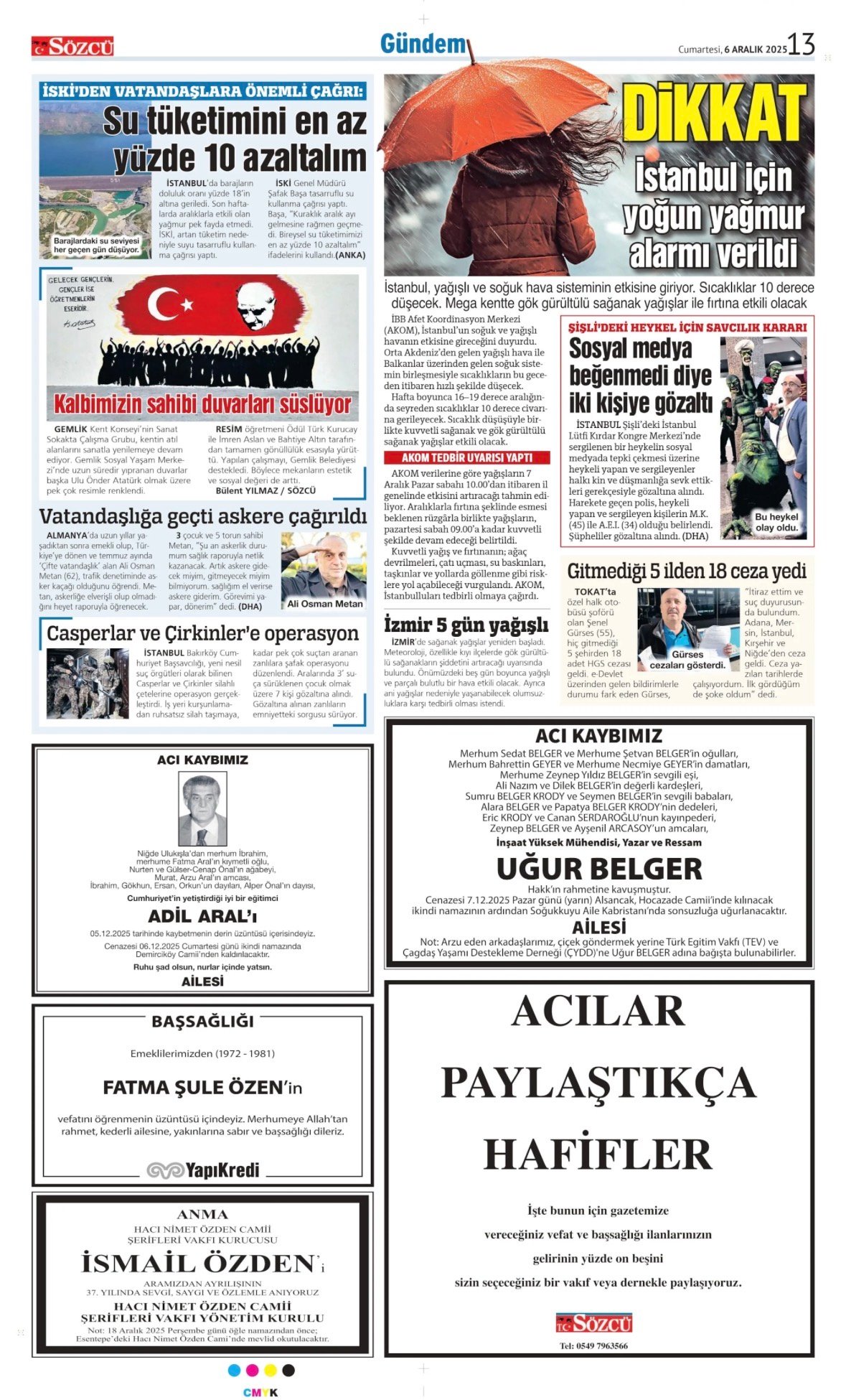 Sözcü Bugünkü Vefat İlan- Başsağlığı İlanı- Anma İlanları ve Arşiv Sayfalar. 13.12.2025