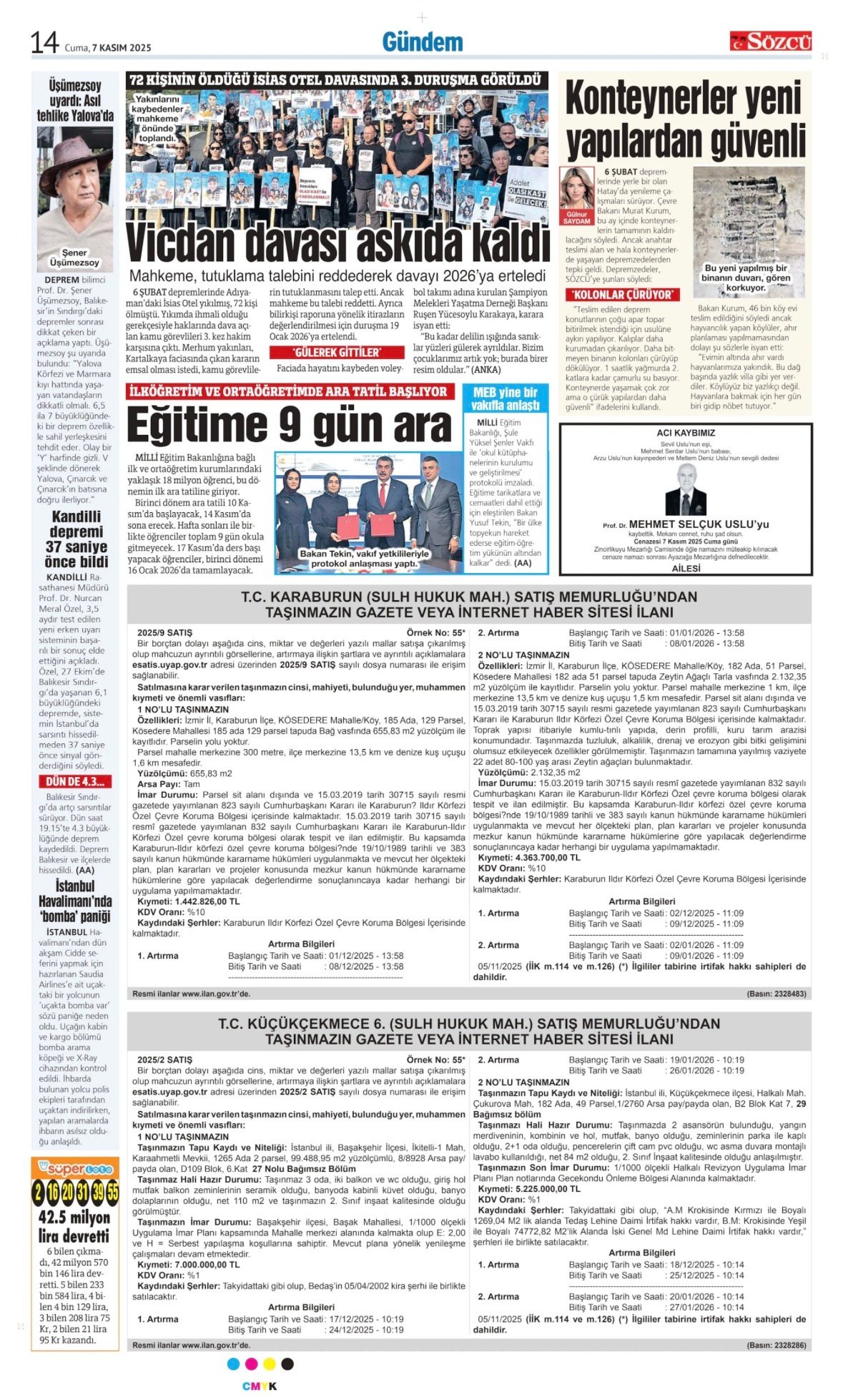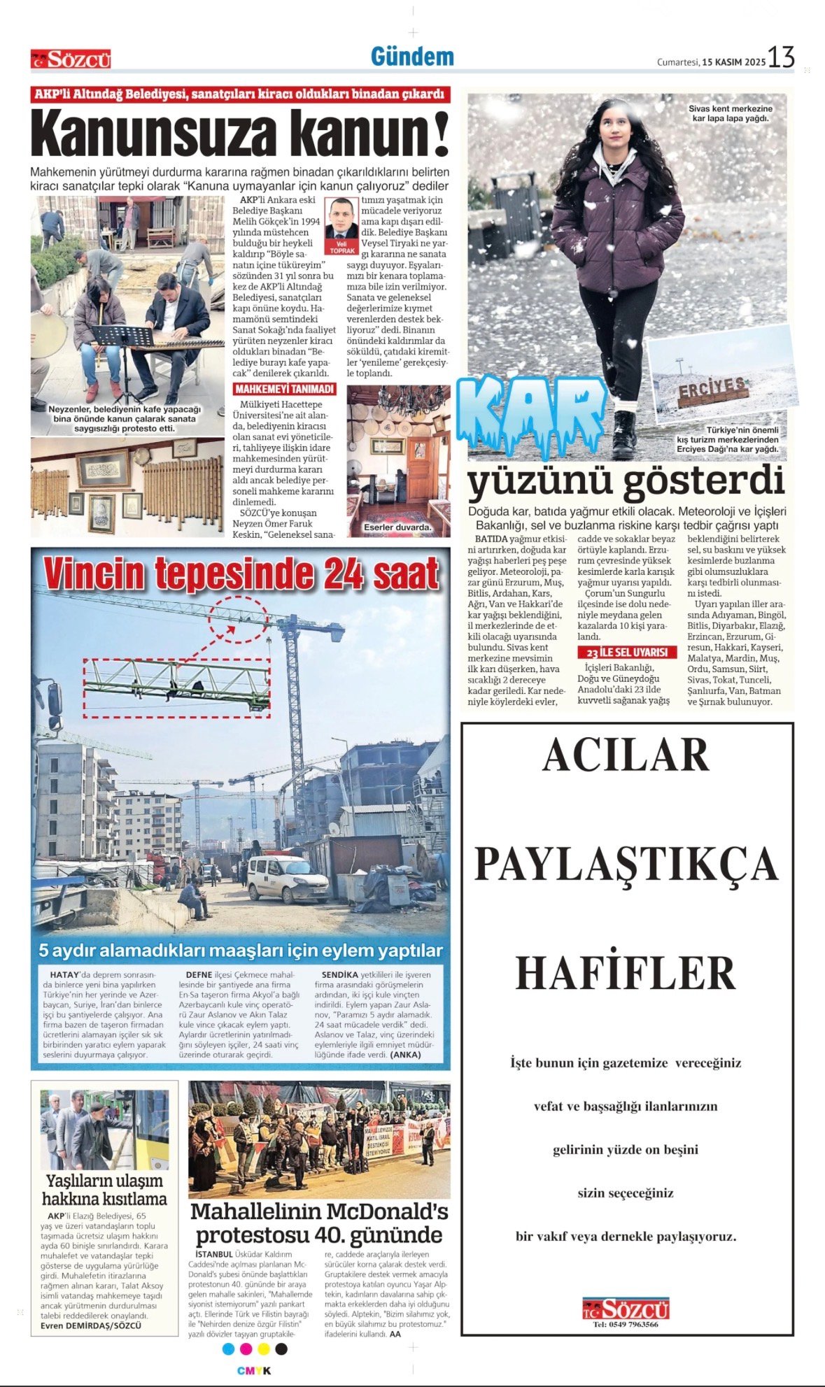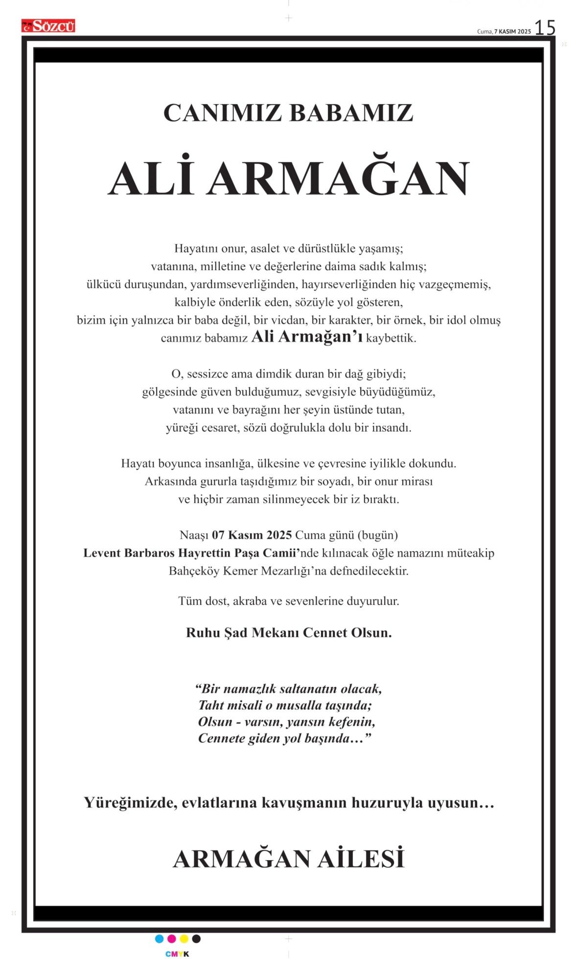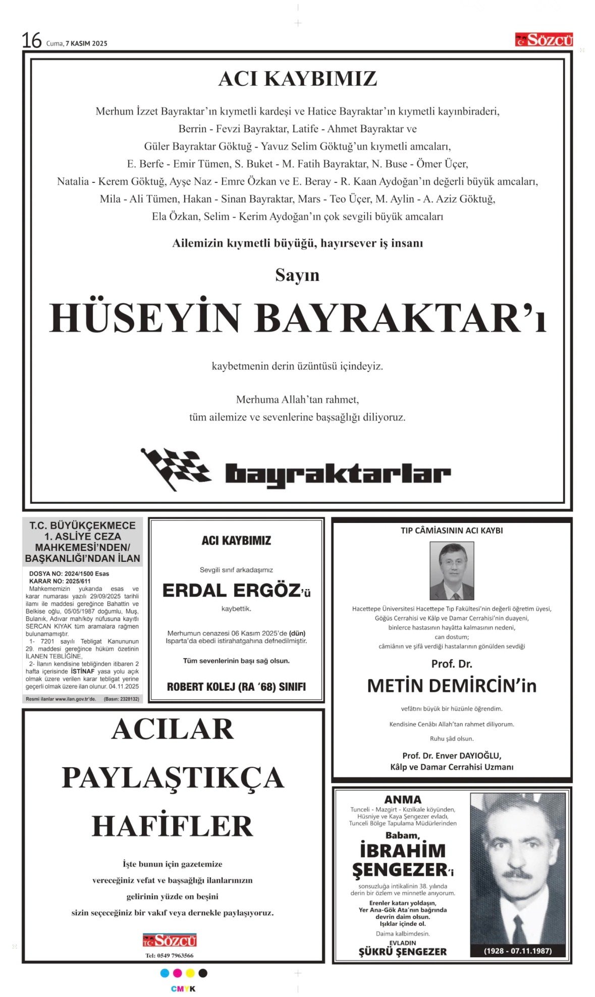 Sözcü Bugünkü Vefat İlan- Başsağlığı İlanı- Anma İlanları ve Arşiv Sayfalar. 15.11.2025