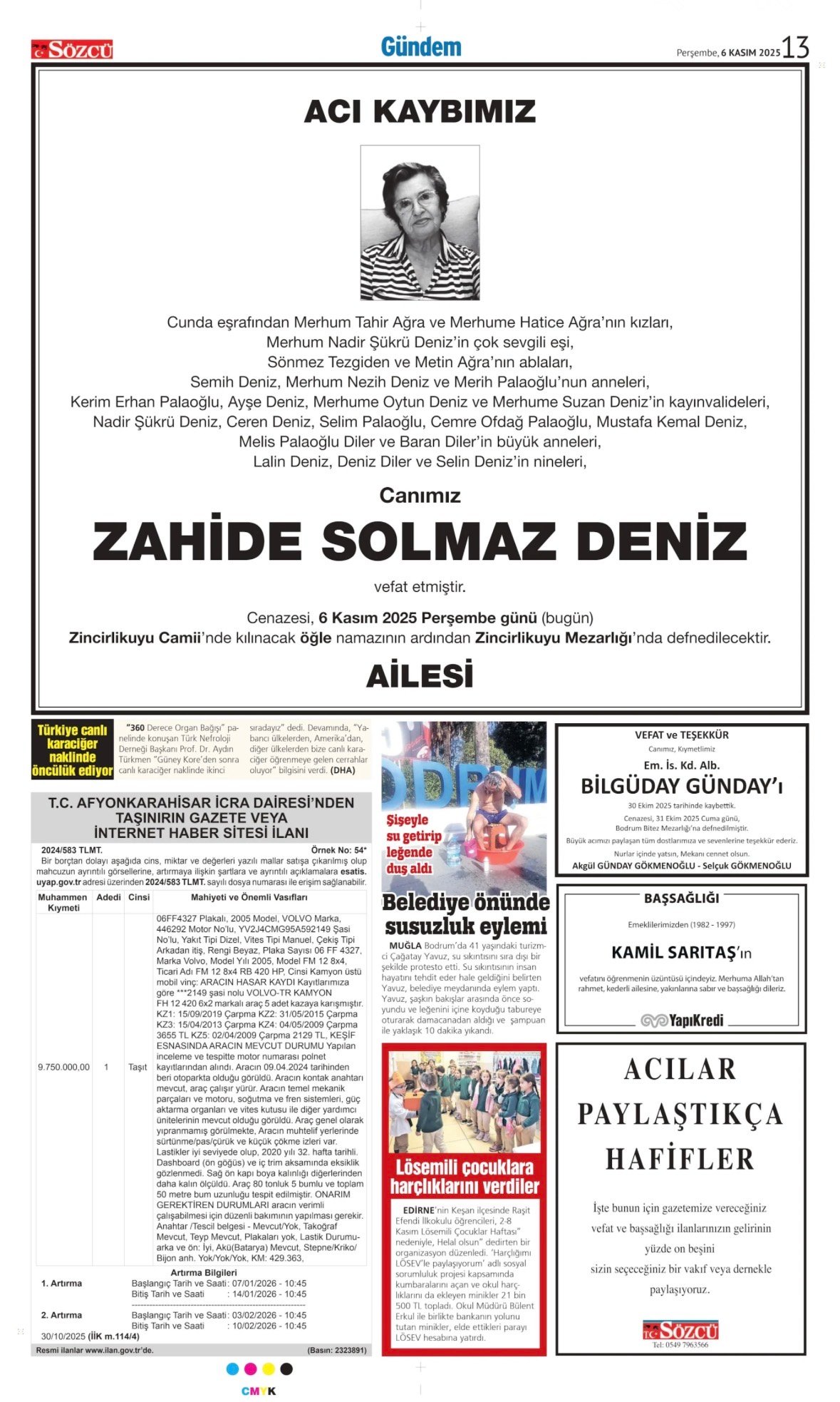 Sözcü Bugünkü Vefat (Ölüm) – Başsağlığı – Anma – Teşekkür – Mevlit İlanları-13.11.2025
